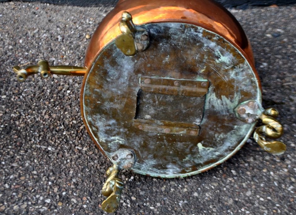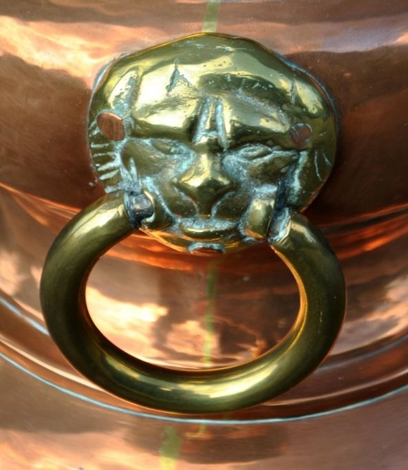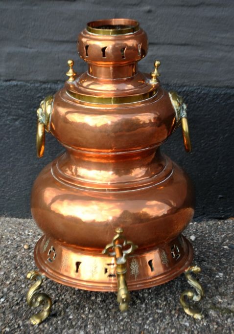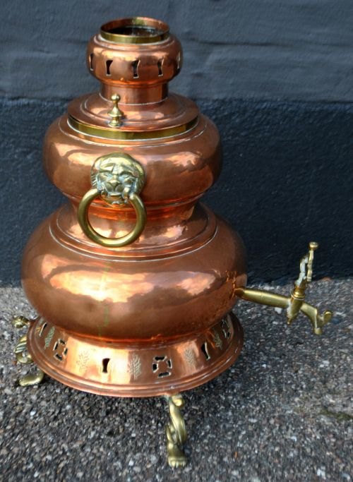 Themaskine i kobber, barok, 18. årh. Danmark. Ben, håndtag og tappehane af messing. Dekoreret med løvehoved og løvefødder. Indvendig fortinnet. H: 41 cm. Dia: 23,5 cm.
