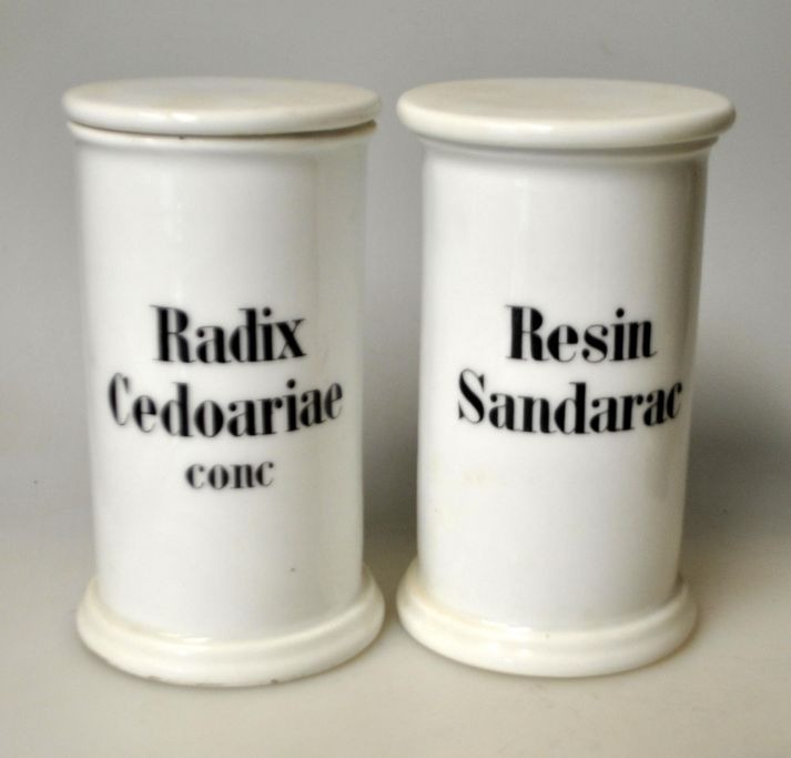Par porcelæns apoteker krukker med låg, 19. årh. Royal Copenhagen, København, Danmark. Hvidt porcelæn med låg. Med sort tekst. Stemplet i låg. H.: 14 cm.