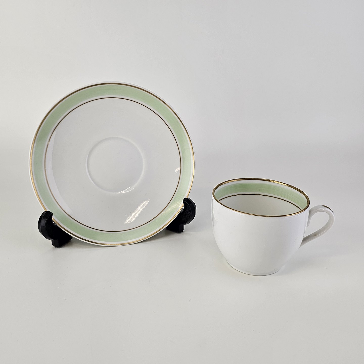 Glat hvidt porcelæn med lysegrøn bord og guldkant