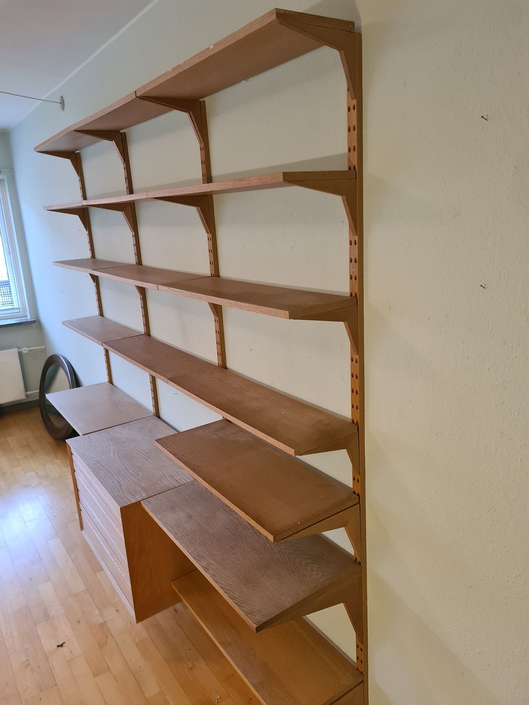 FM vægreolsystem fra 1960'erne i eg designet af Kai Kristiansen. Sættet består af 1 kommode (HxBxD 52x80x38), 2 hylder (HxBxD 2x80x38), 3 hylder (HxBxD 2x80x30), 12 hylder (HxBxD 2x80x33) og 4 vanger til ophængning. Generelt i pæn brugt stand dog svajer et par hylder en anelse. (Billede)