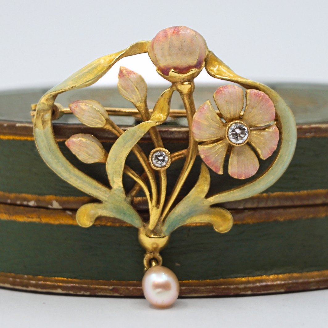 Art nouveau broche i 18 kt. guld med emalje, diamanter og perle |