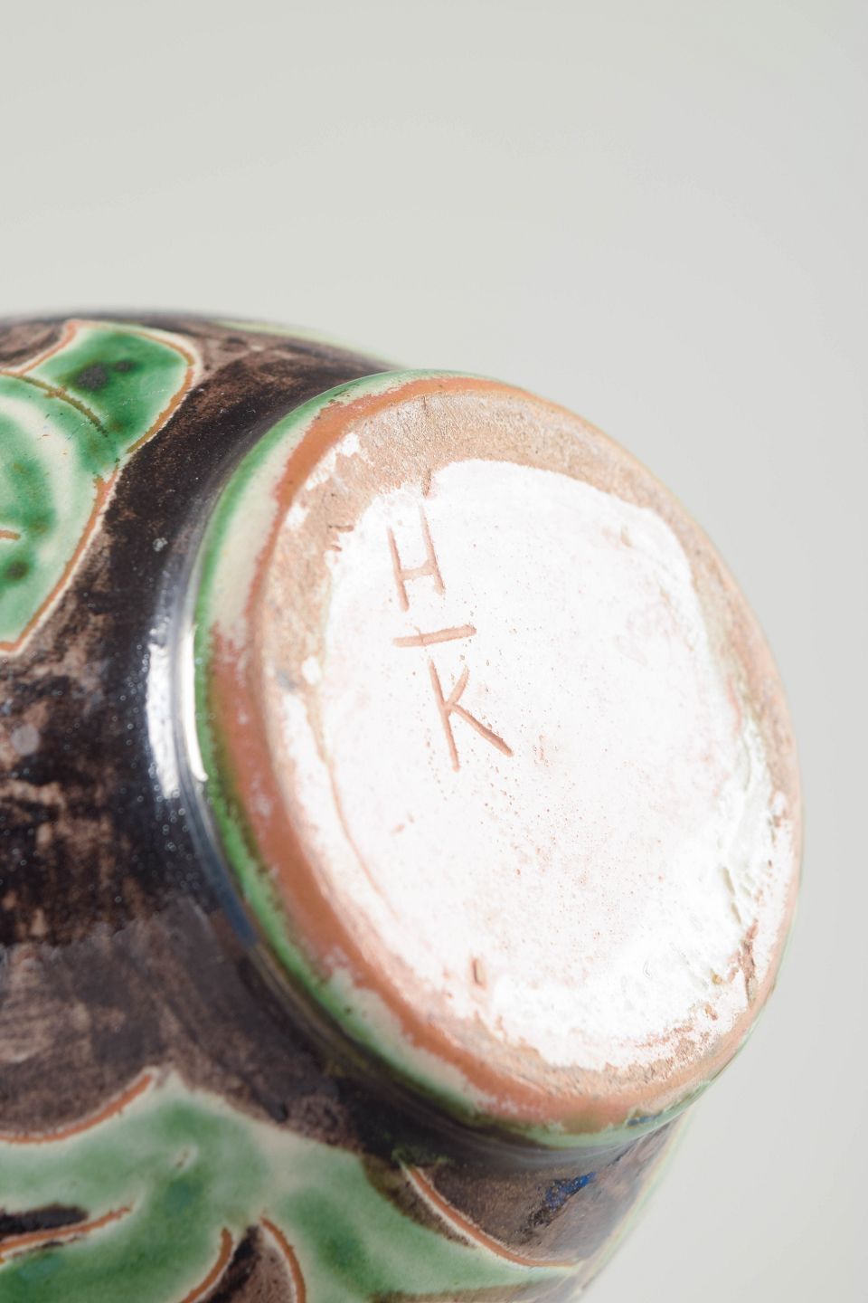 Dekorativ vase i glaseret lertøj med reliefdekoration forestillende fisk og tang i grønne og brune nuancer. Et karakteristisk eksempel på dansk midt-århundredes værkstedsproduktion med naturinspirerede motiver og livlig farvekontrast.