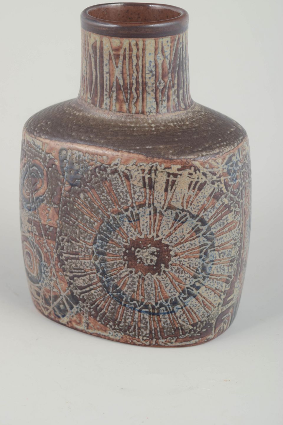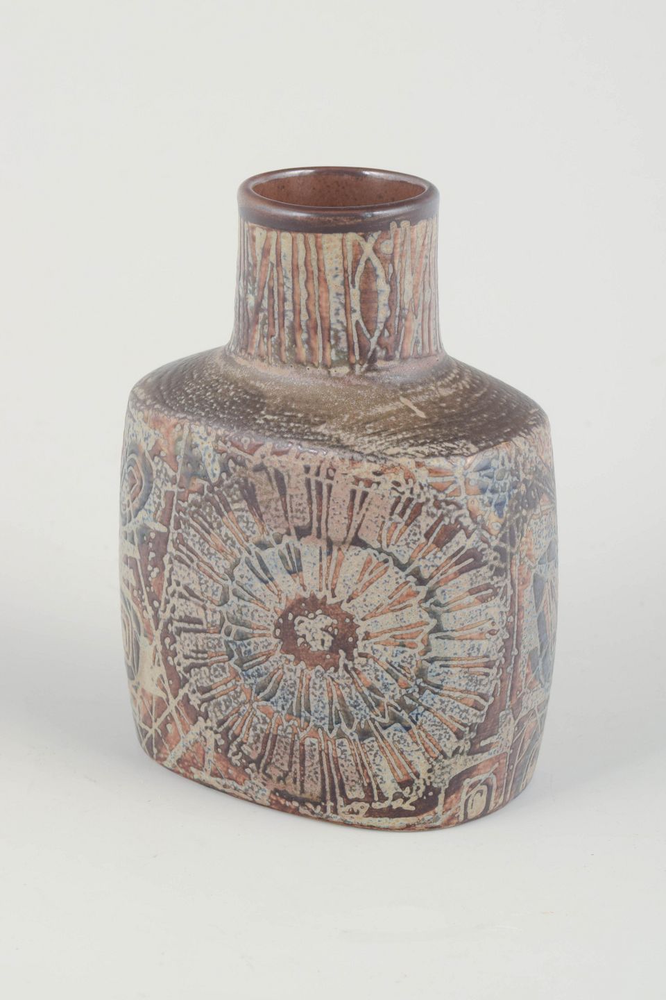 Rektangulær vase i stentøj med rundet skulder og karakteristisk hånddekoreret glasur i blå, beige og brunlige nuancer fra Thorssons Baca-serie. Dekoreret i relief med abstrakte og naturinspirerede motiver, typiske for Thorssons formsprog i perioden.