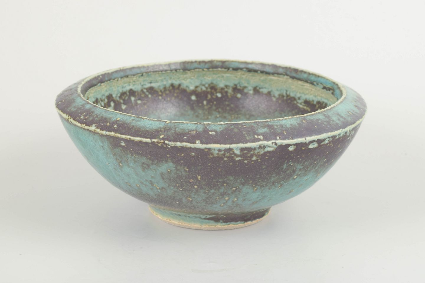 Hånddrejet stentøjsskål med bred, afrundet kant og levende blågrøn glasur over mørk brunlig bund.