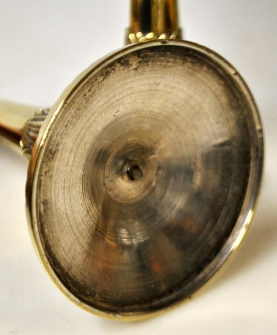 Par franske lysestager i messing, 19. årh. Tidligere forsølvet. H.: 25,5 cm.