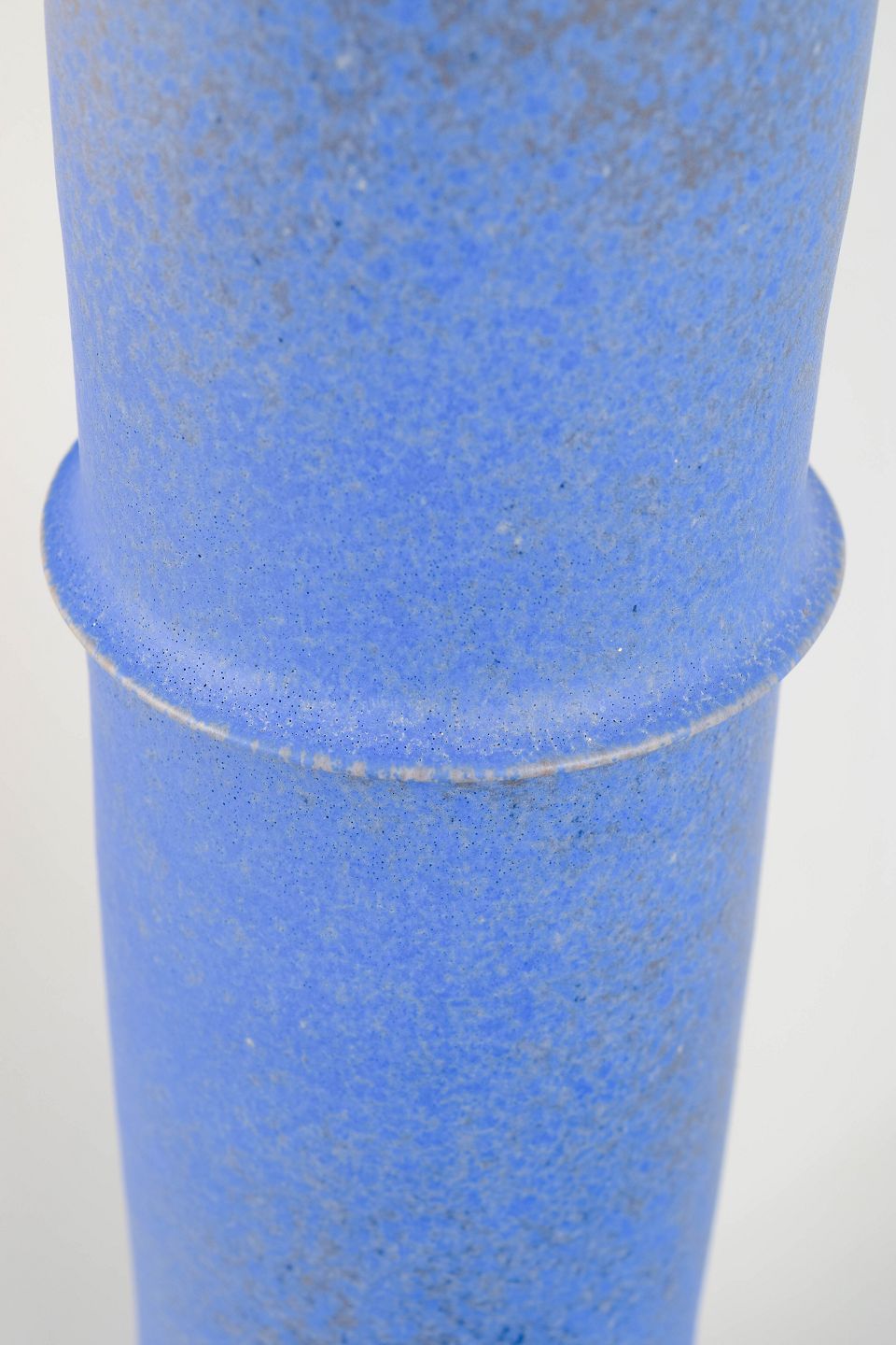 Meget stor, skulpturel studiekeramik-vase i cylindrisk form med karakteristisk todelt profilering og smal, opadstrittende hals. Udført i stentøj med levende, mat blå glasur og fine strukturelle variationer. Et markant og dekorativt unika-arbejde i stor skala.
