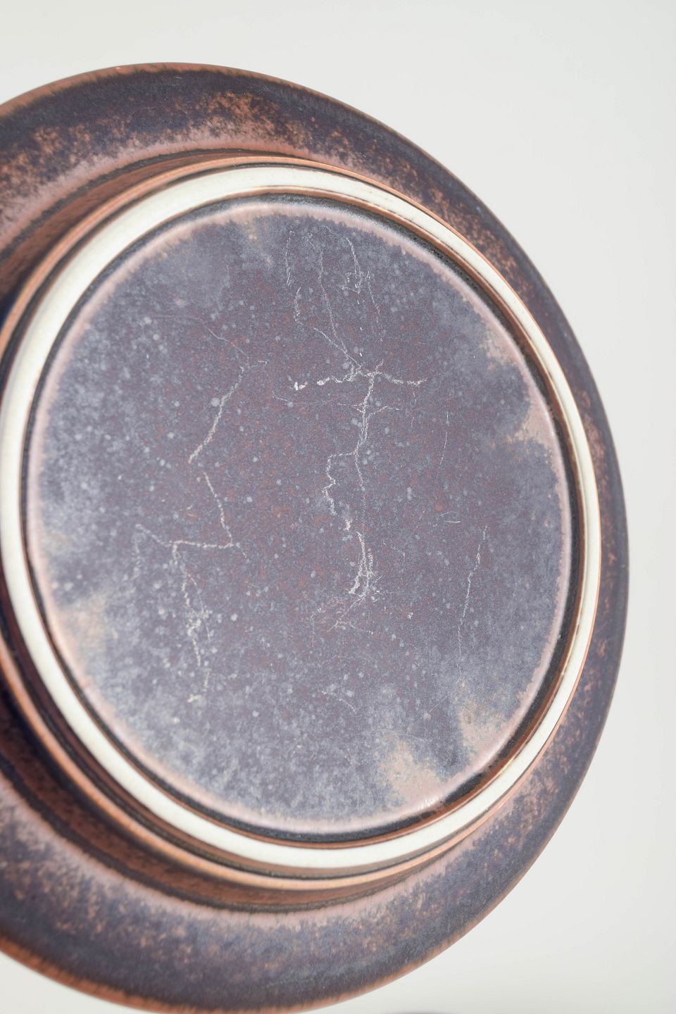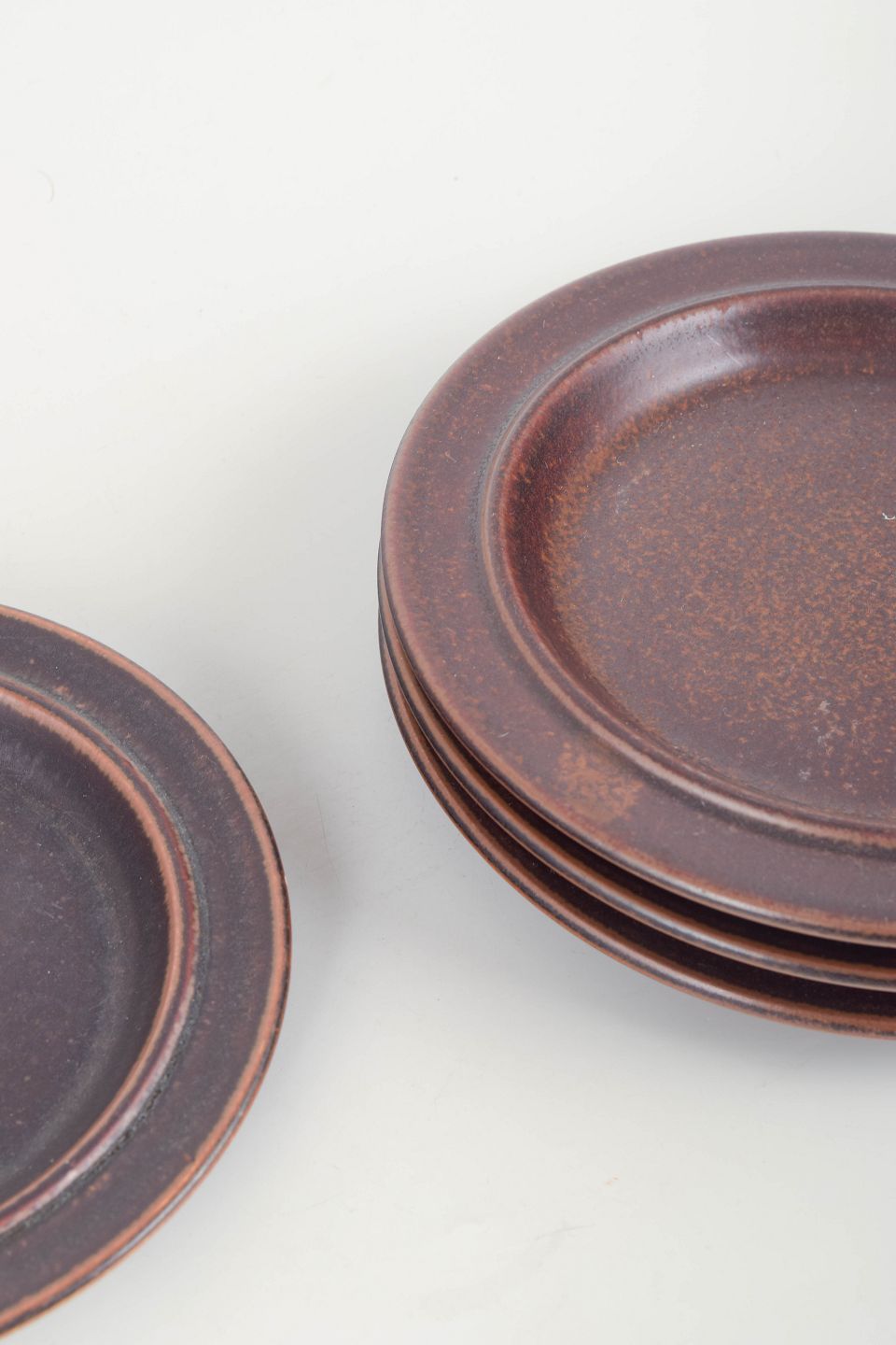 Fire mindre tallerkener i den ikoniske “Ruska”-serie, udført i mørkebrunt stentøj med den karakteristiske matte jernglasur, som varierer smukt i overfladens tone og struktur.