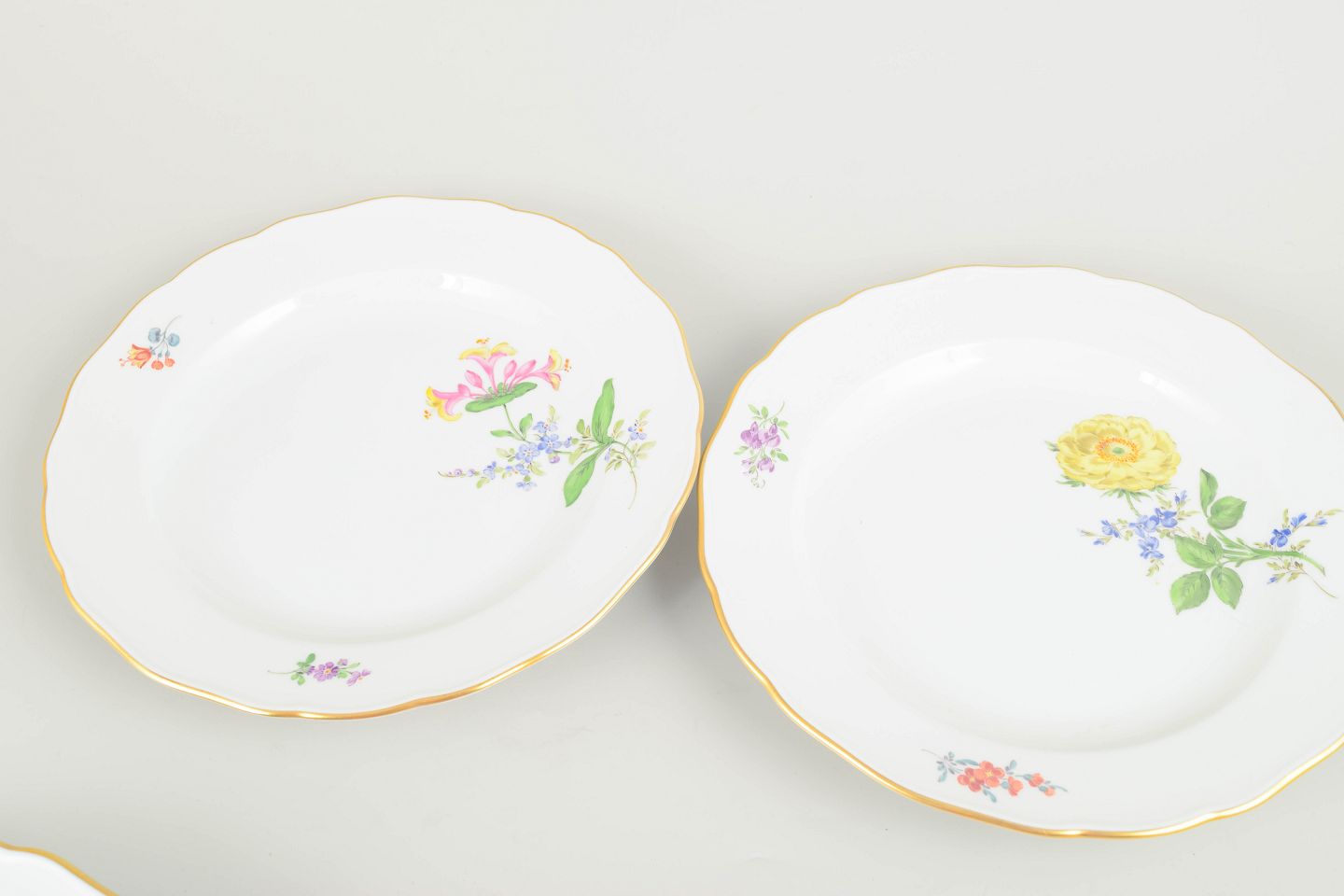 Fire antikke Meissen-tallerkener i porcelæn med håndmalede blomsterdekorationer og forgyldt kant. Klassisk form med svungen rand og detaljerede polykrome buketter, udført i den høje kvalitet Meissen er kendt for.