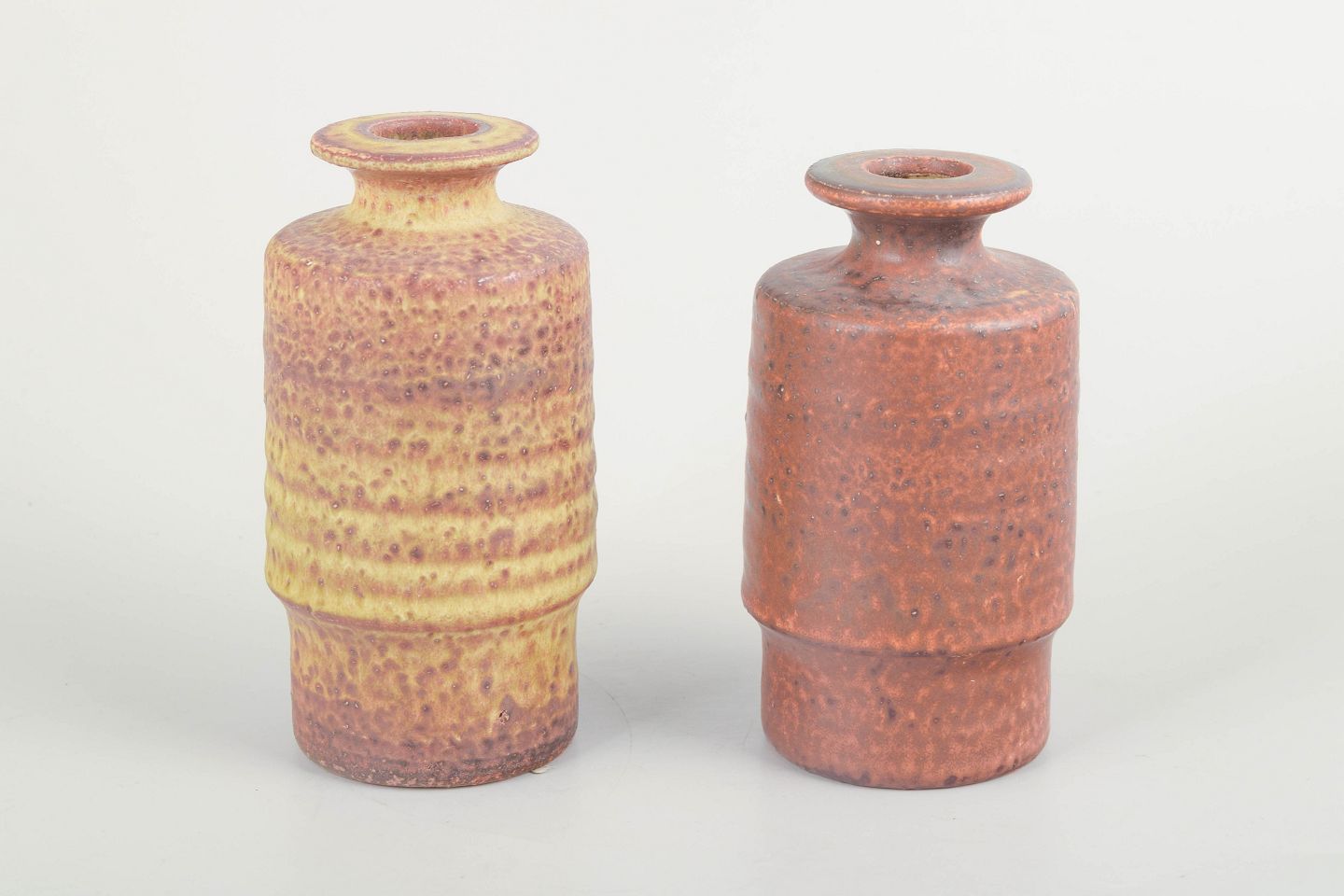 Par af hånddrejede stentøjsvaser med karakteristisk Mobach-tekstur og mat, nuanceret glasur i henholdsvis gule og rødbrune toner. De cylindriske former og den taktile overflade er typiske for værkstedets modernistiske udtryk.