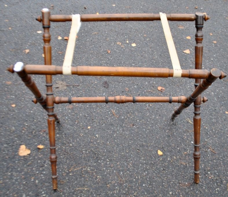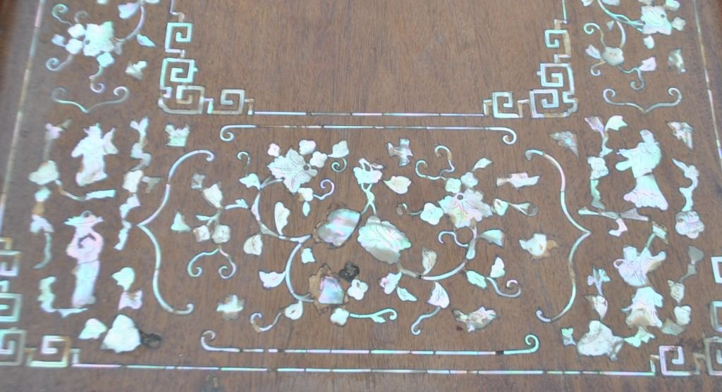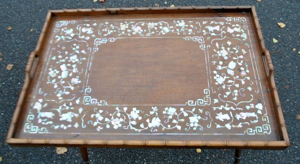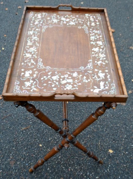 Chinese tray table, 19th century. Tray in precious wood with inlaid mother of pearl. With two handles. 48 x 71 cm. Foldable base H.: 65 cm.