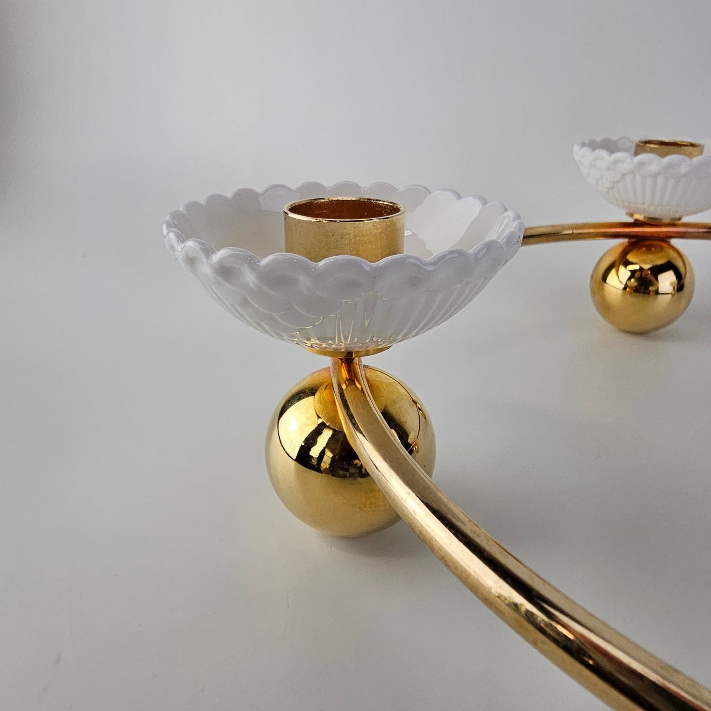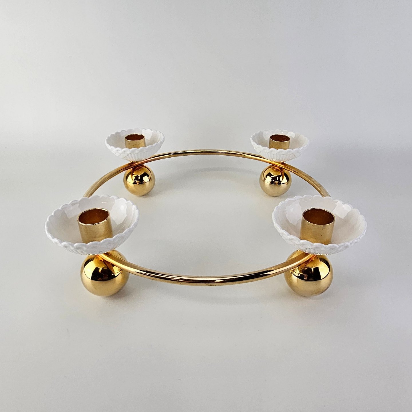 Rund lysestage i forgyldt messing med plads til fire lys i små hvide skåle af kongeligt porcelæn. Stagen er fra serien Creating Moments og kommer i original kasse