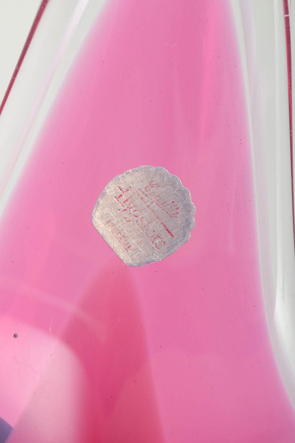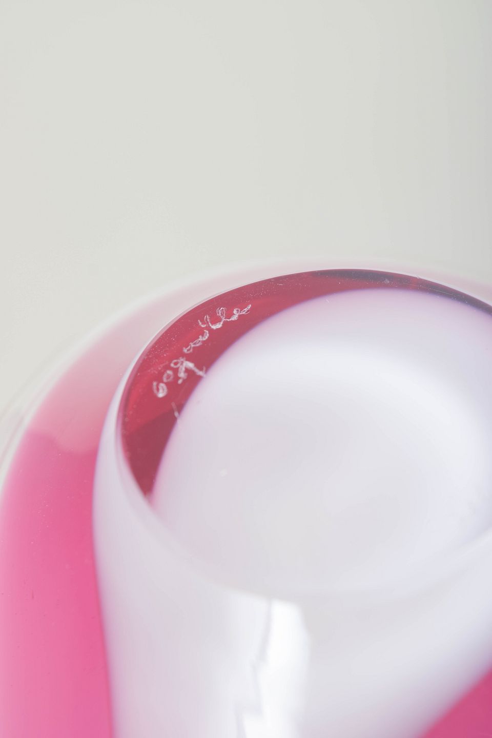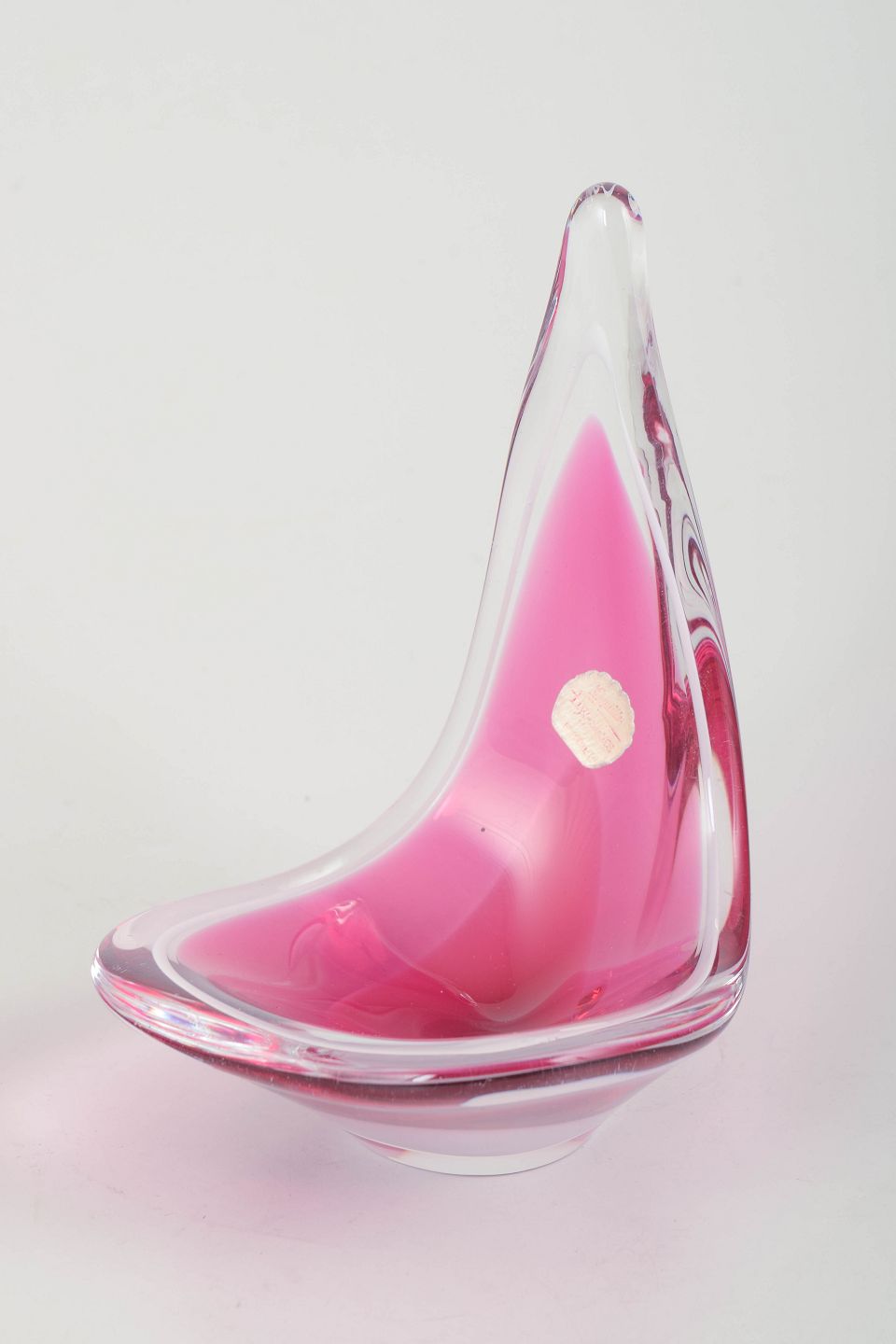 Organisk formet kunstglas skål i klart glas med lag i rosa og hvid. Mundblæst med den karakteristiske svungne asymmetriske form fra Coquille-serien. Originalt Flygfors-mærke. Signeret.