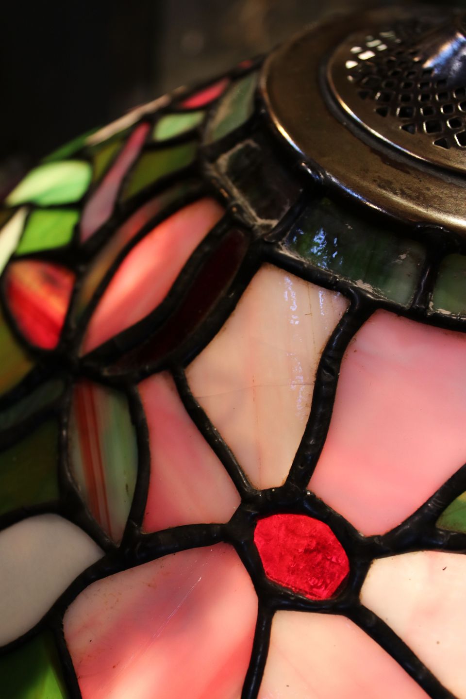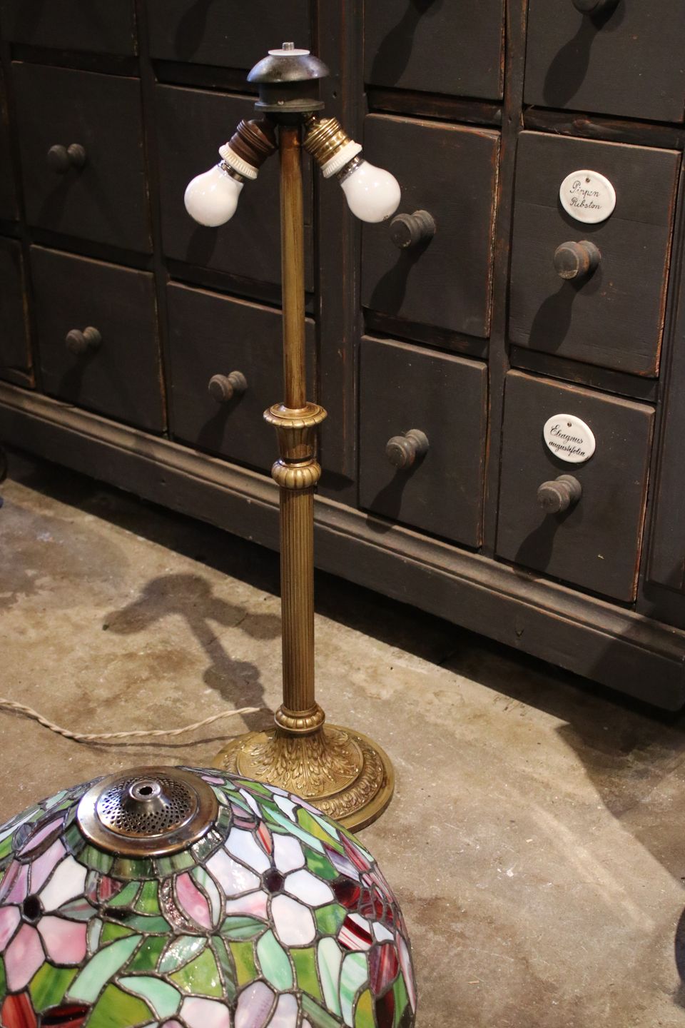 Dekorativ , gammel Tiffany bordlampe fra 40érne. med glasskærm i farvet blomstermotiv og fod i bronze. H: 75cm. Dia.: 42cm.
