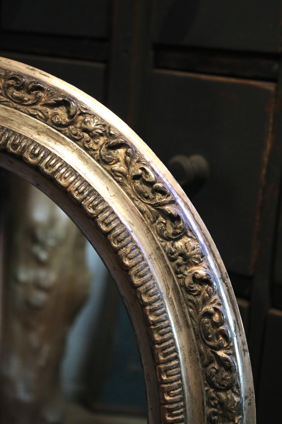 Gammelt fransk ovalt spejl med fin dekoreret bred forsølvet træ ramme...