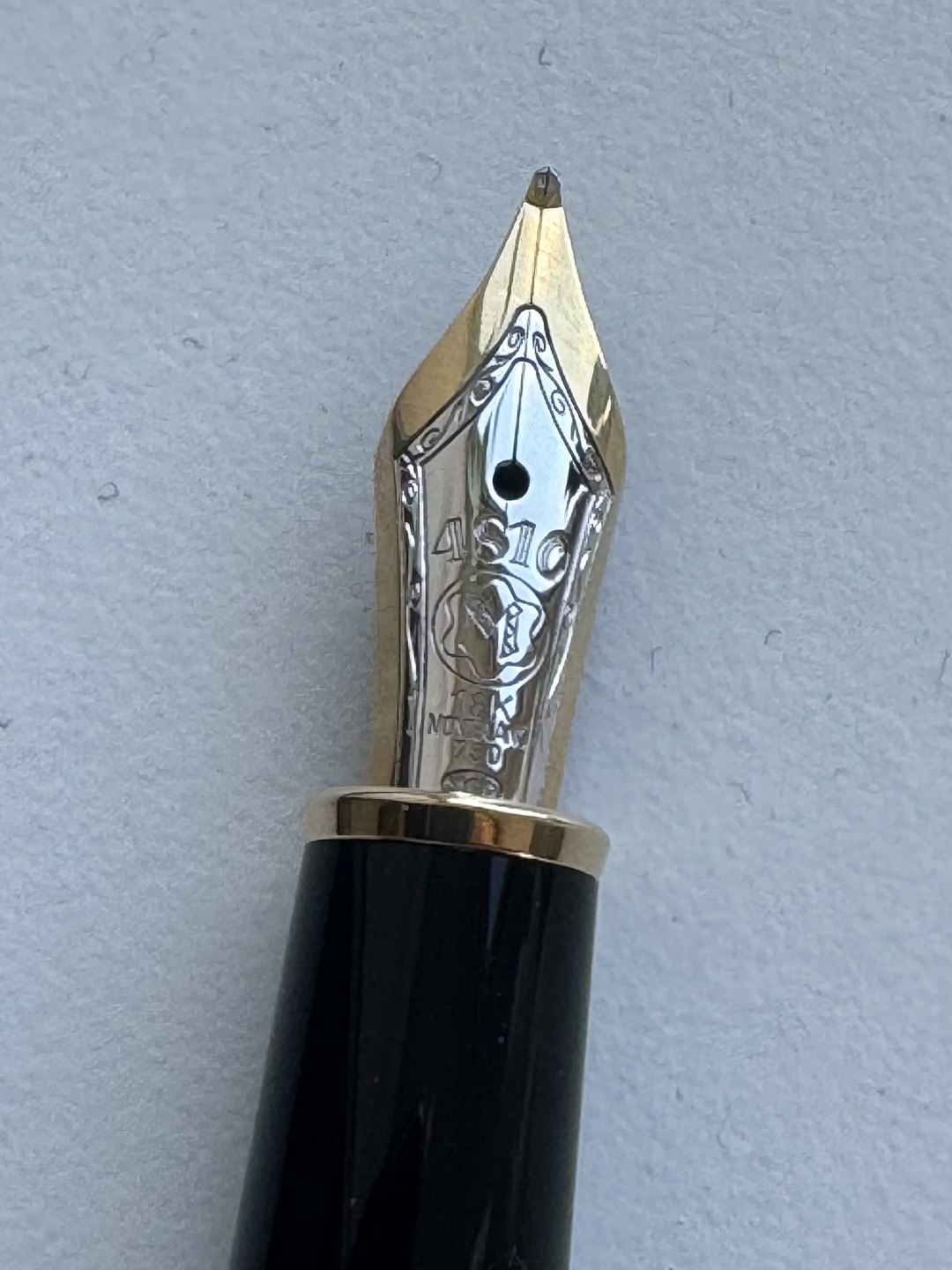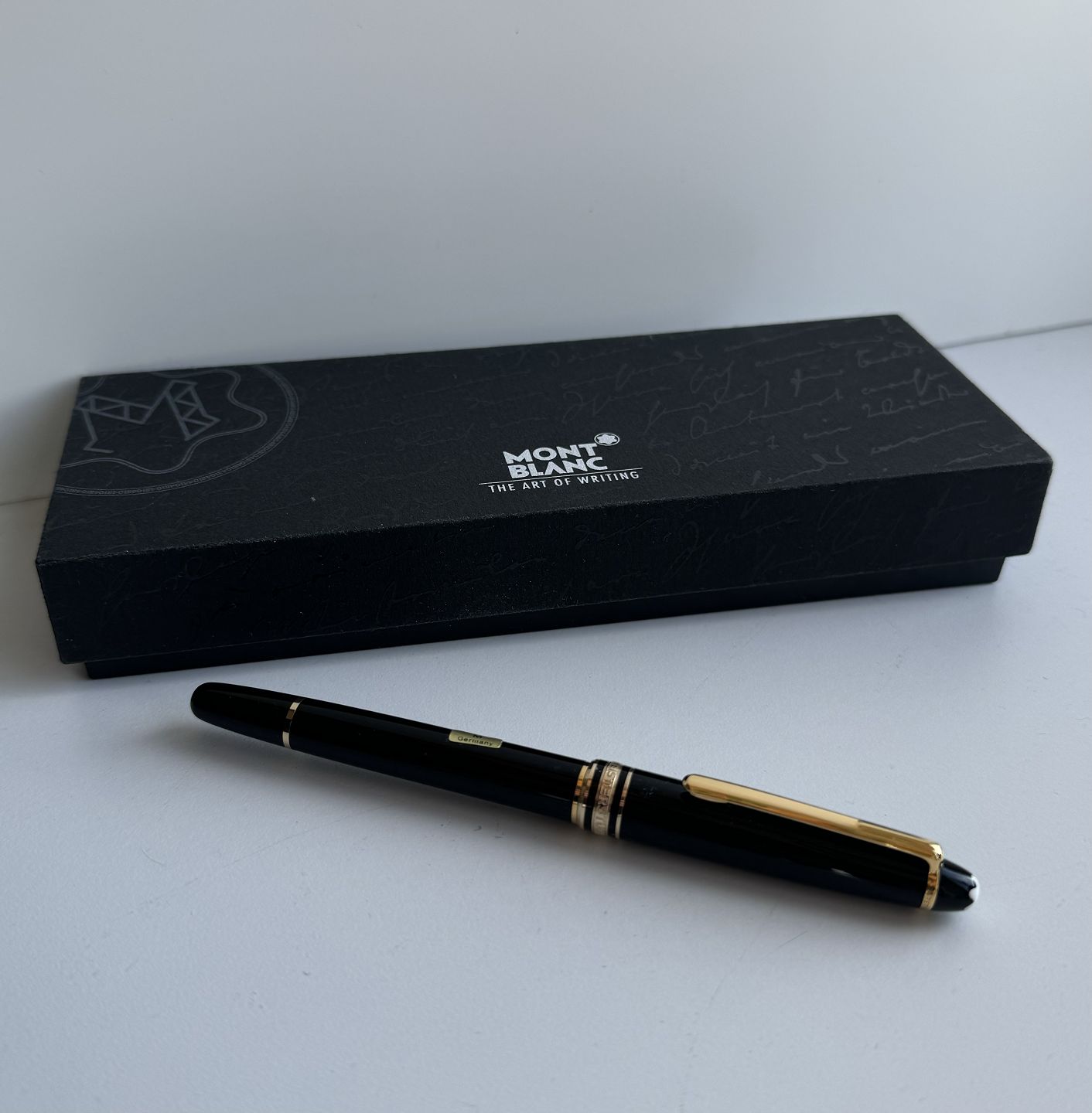 Nyere ubrugt sort Montblanc Classique Meisterstück fyldepen. Fremstår i perfekt stand. Alle dele originale til denne model inklusiv den elegante 18 karat’s to-farvede Montblanc guldspids i Medium størrelse (se label på fyldepennen). Original æske samt instruktionsbog medfølger.