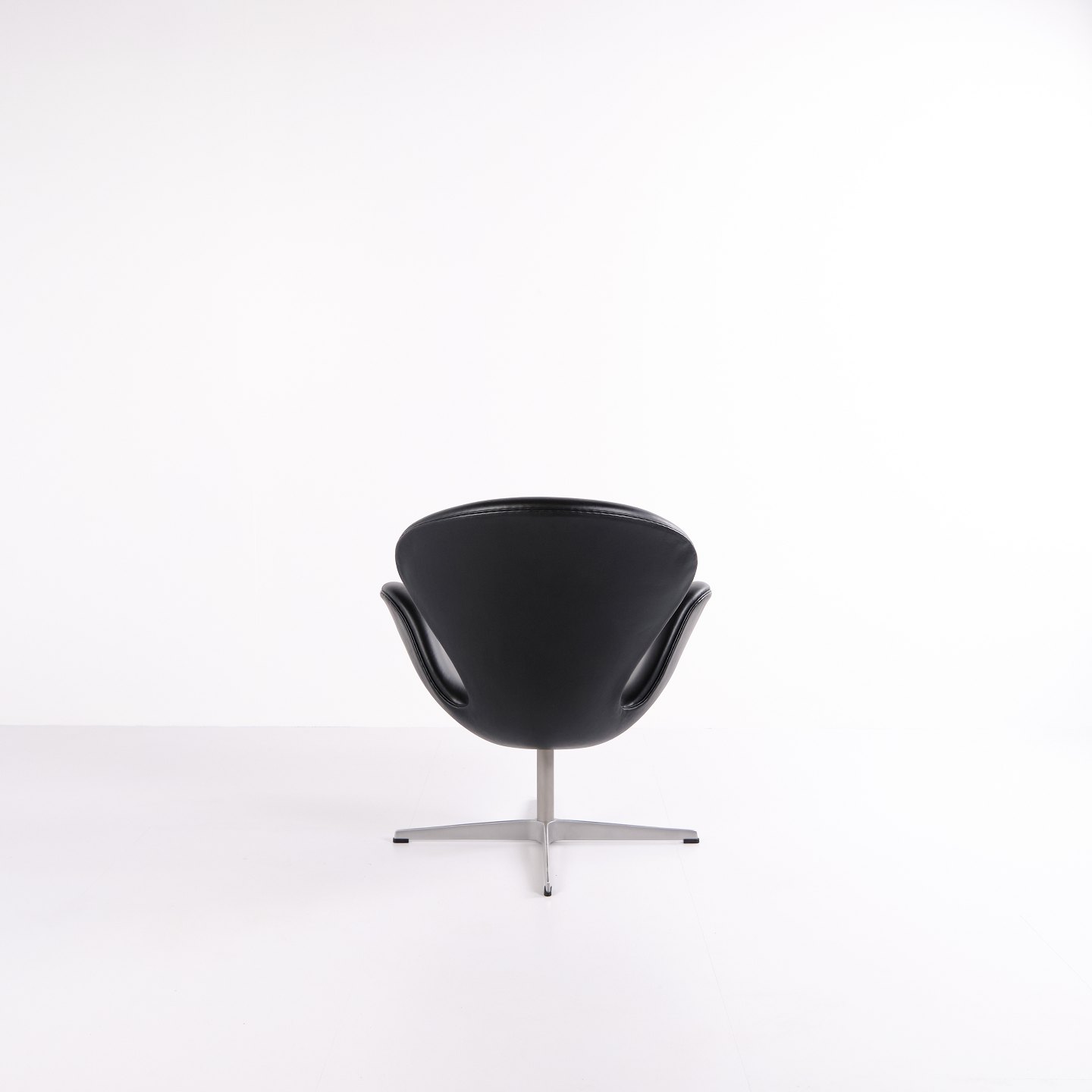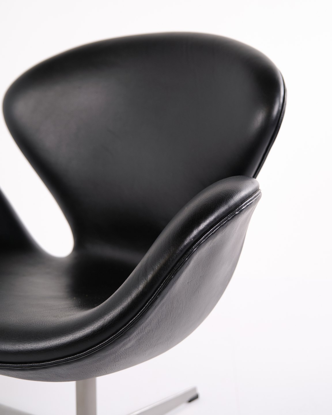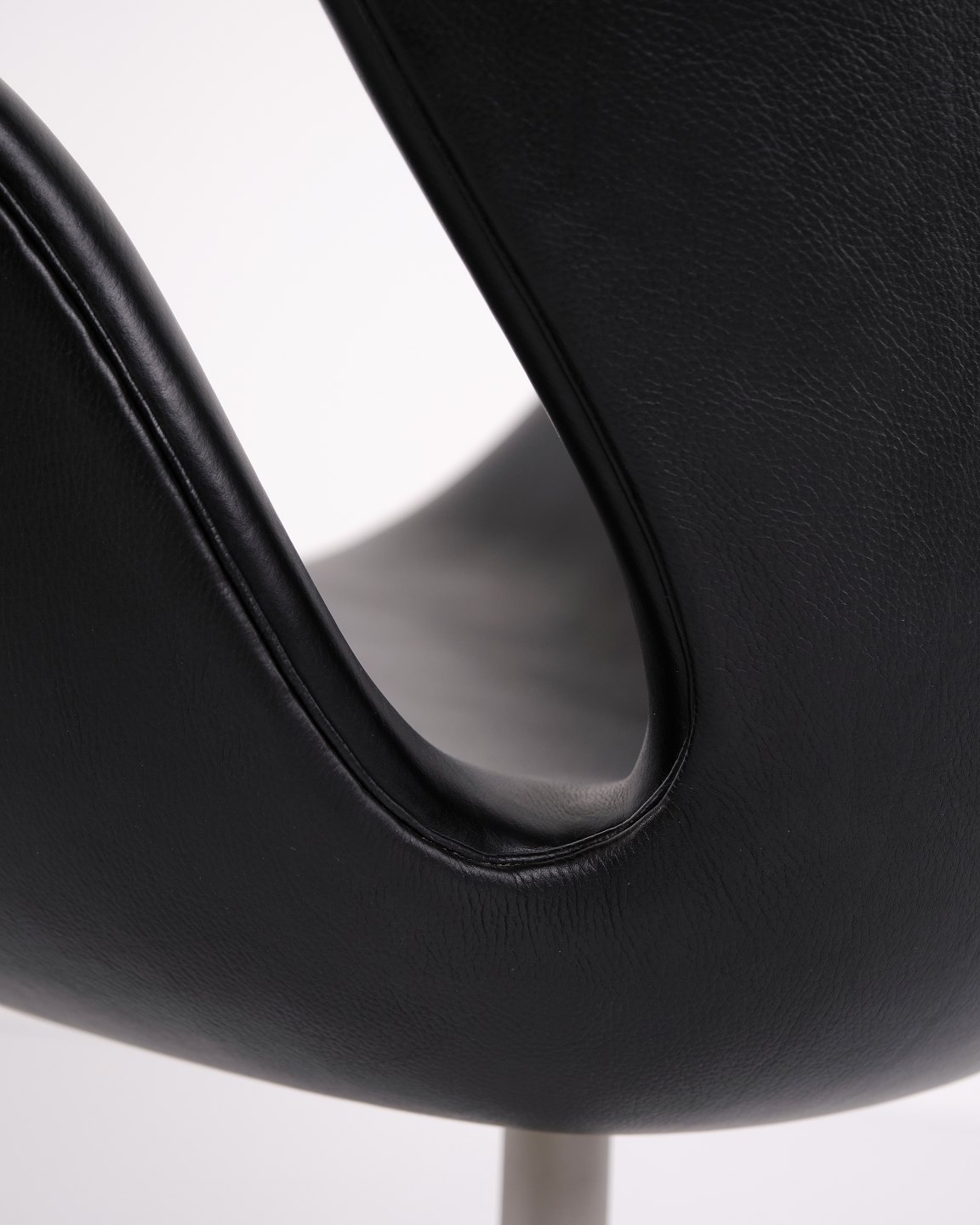 Svane stol designet af Arne Jacobsen og fremstillet af Fritz Hansen i 2002. Udført i sort Elegance læder, som er en højkvalitets anilinlæder med smuk dybde og naturlig struktur. Modellen er en videreførelse af Jacobsens originale design fra 1958 og produceret i Danmark med samme håndværksstandard som de tidlige udgaver.