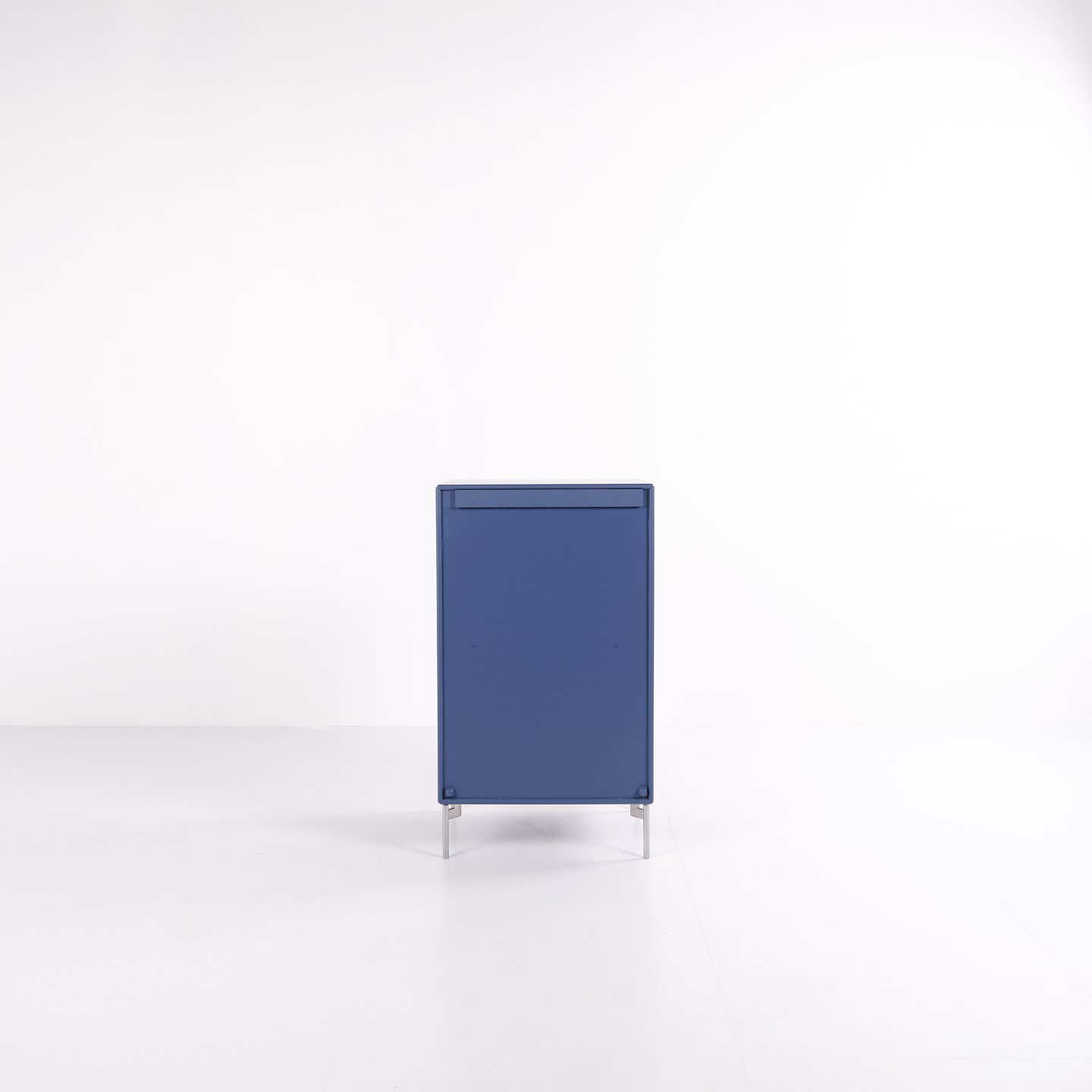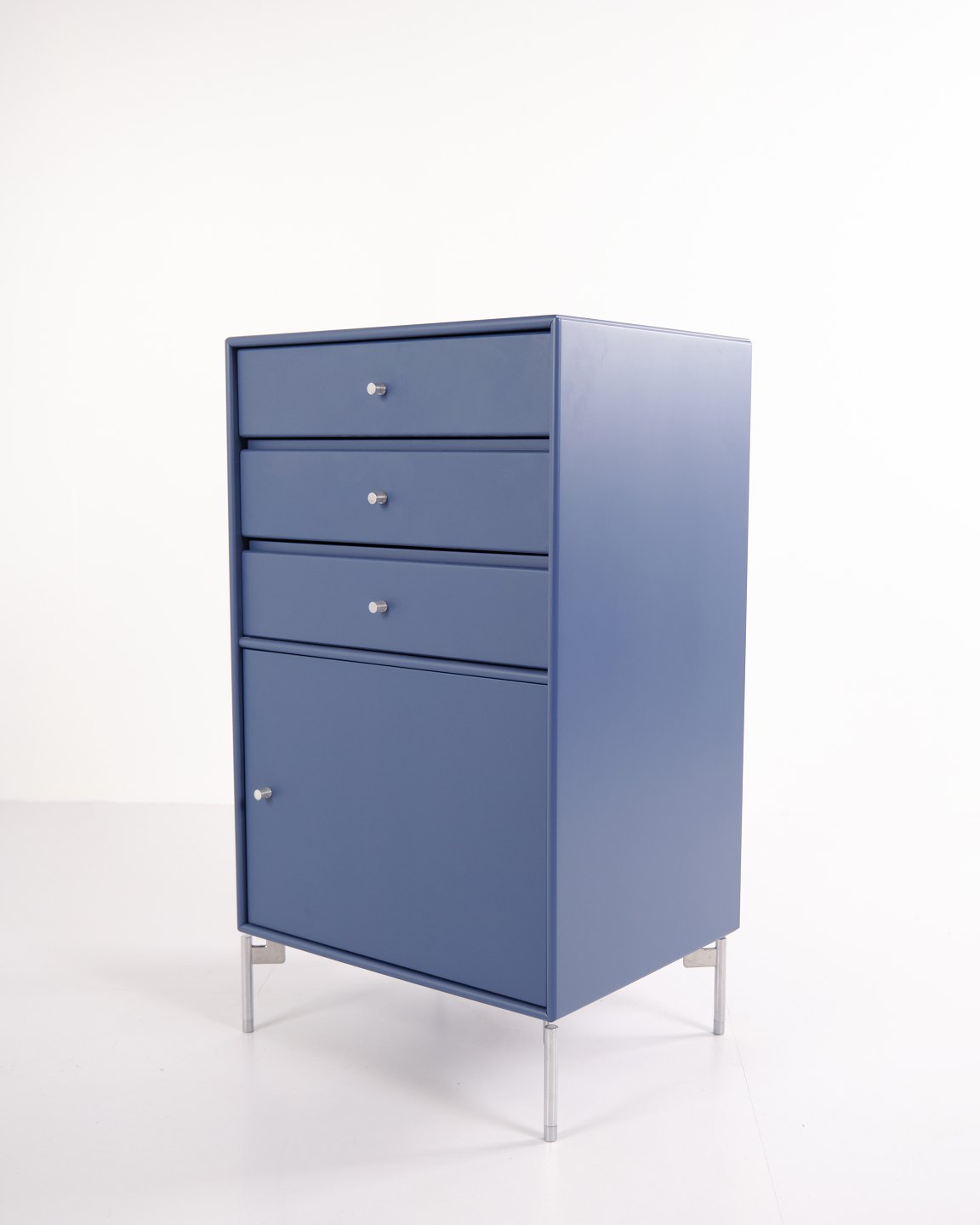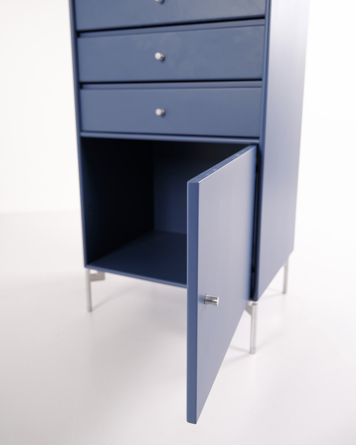 Montana skab / arkivskab i blå, monteret med krom ben. Indrettet med tre skuffer og én låge, ideelt til opbevaring i kontor, stue eller entre. Klassisk Montana-modul med høj funktionalitet og tidløst design.
