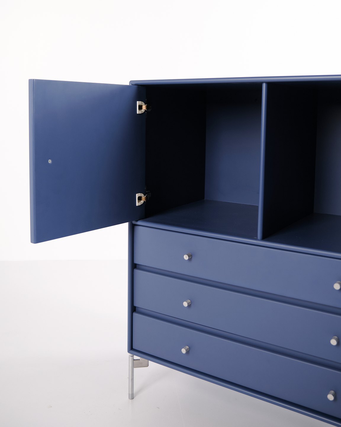 Montana kommode i blå med krom ben. Modulet er indrettet med tre skuffer og én låge, hvilket giver praktisk og fleksibel opbevaring. Et klassisk Montana-design med enkel struktur og høj funktionalitet.