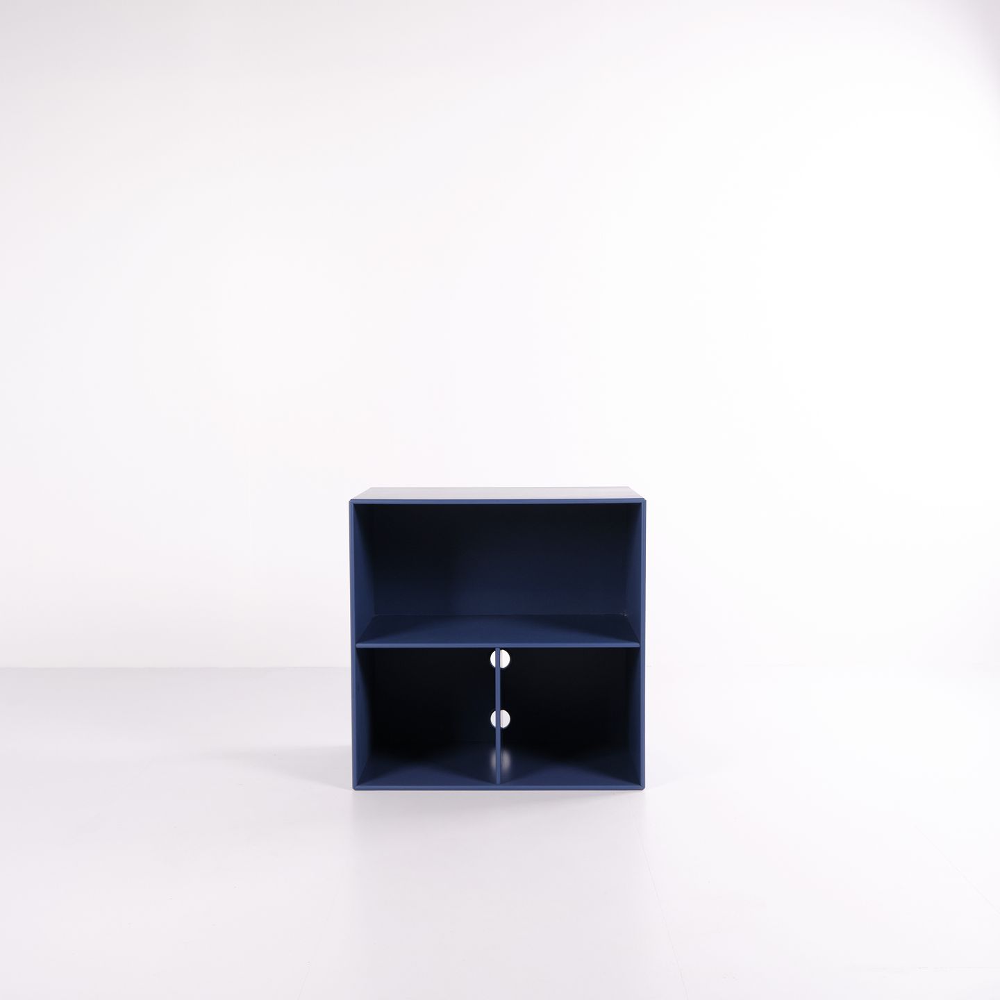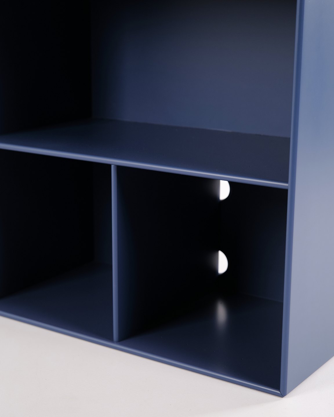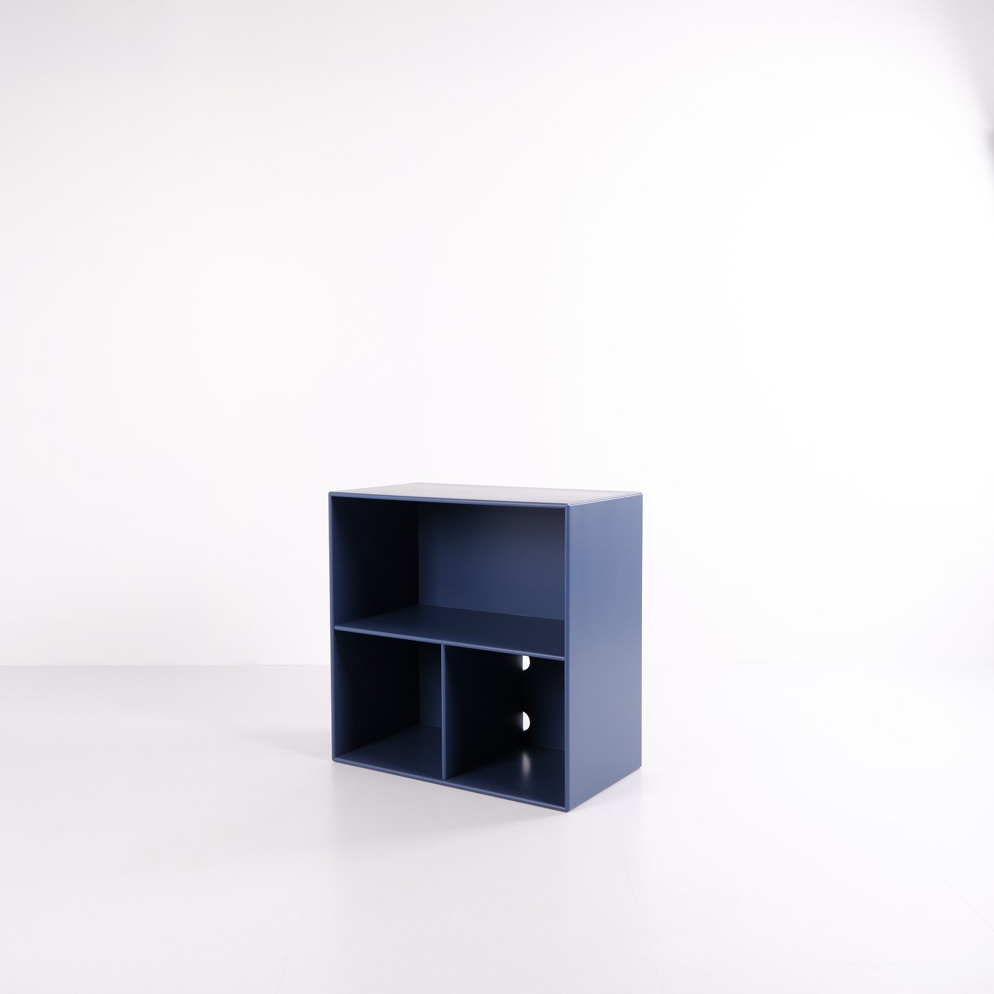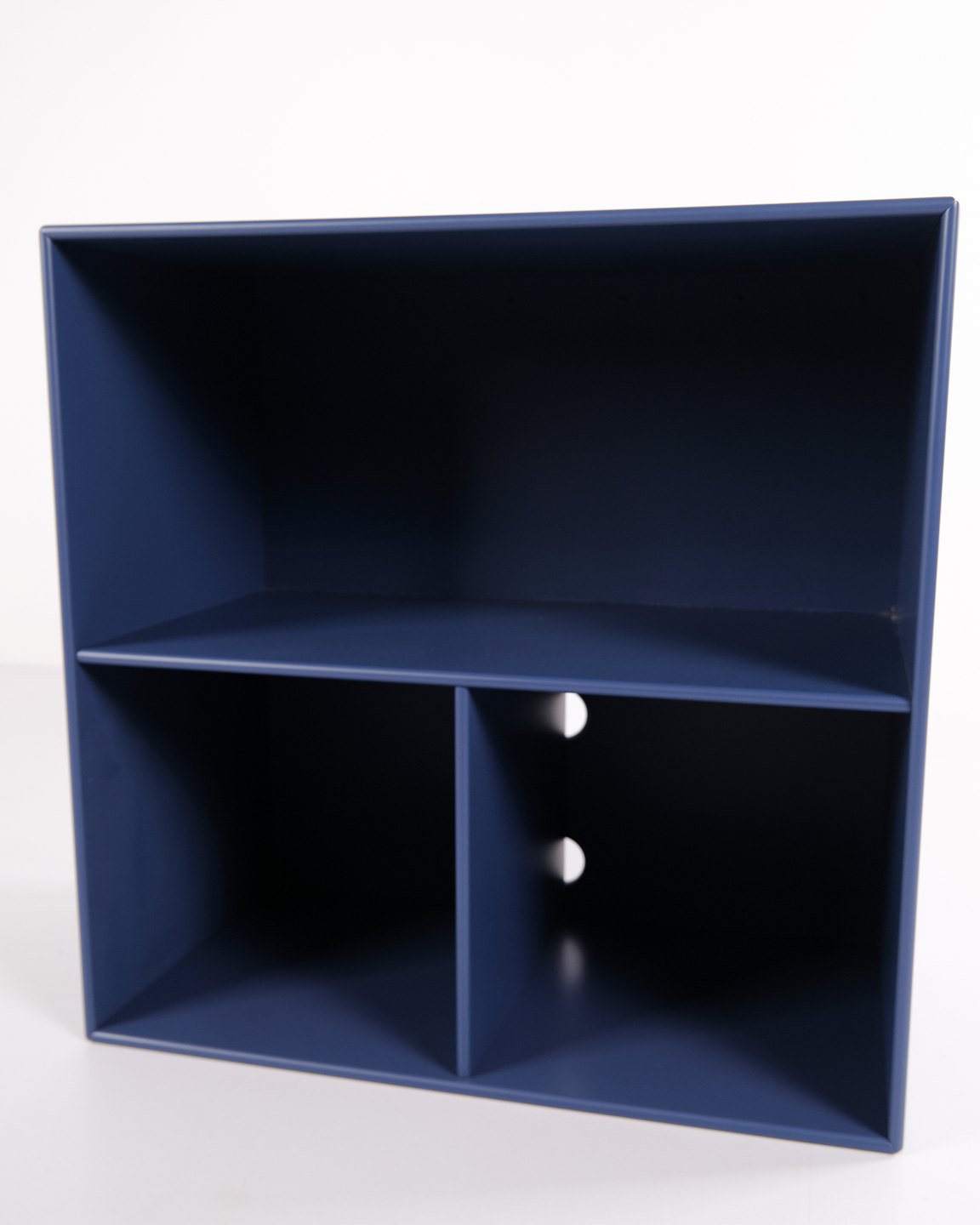 Montana reol i blå med krom ben. Udstyret med tre åbne hylder, ideel til opbevaring eller udstilling i stue, kontor eller entré. Klassisk Montana-modul med enkel opbygning og høj funktionalitet.