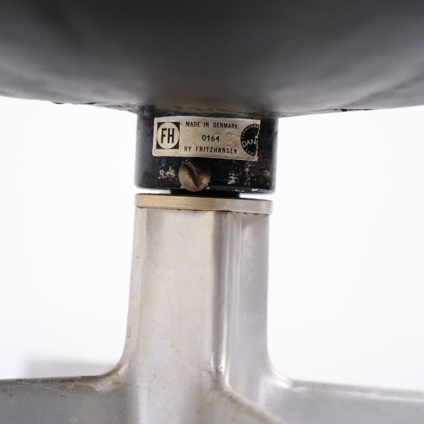 Ægget stol designet af Arne Jacobsen og produceret af Fritz Hansen. Ældre model, betrukket med sort original læder og monteret på aluminiumsfod. Et klassisk dansk designikon fra en tidligere produktionsperiode, hvor stolen blev udført med markante organiske kurver og en særlig dyb læderkvalitet.