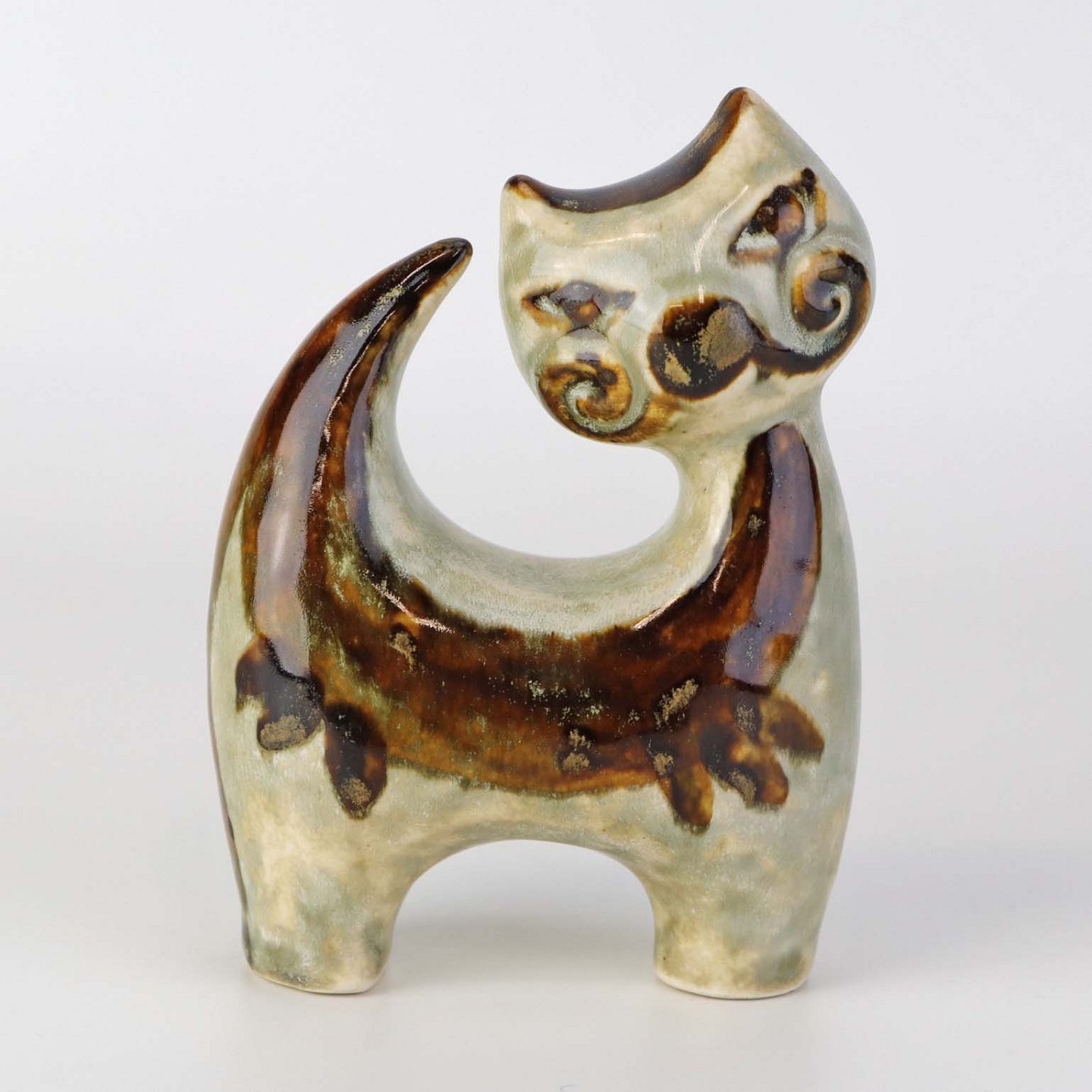 Figur i glaseret keramik med motiv af en kat.