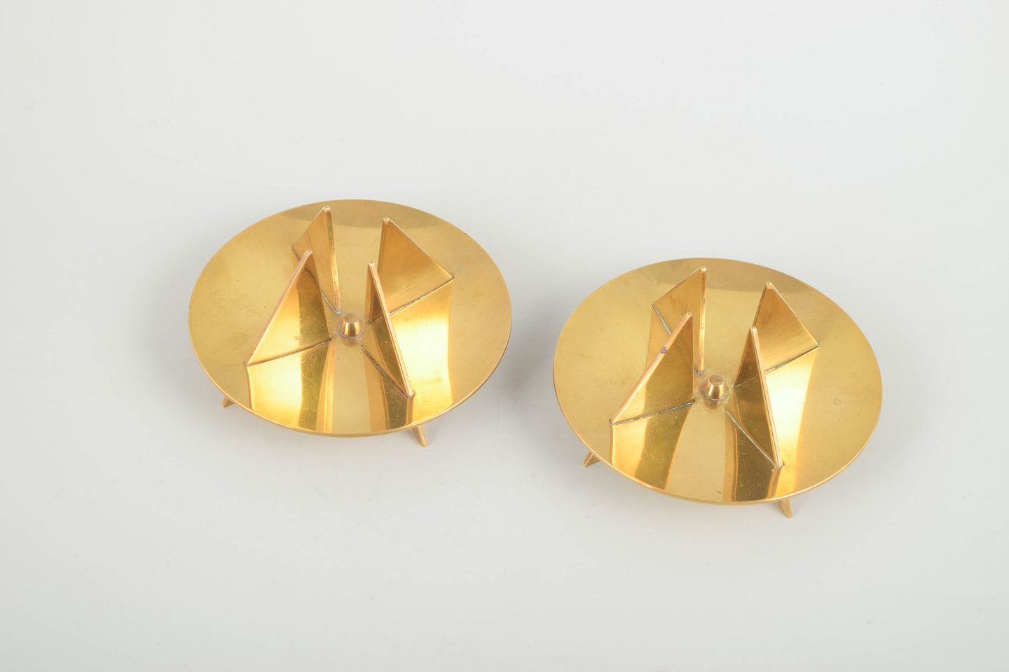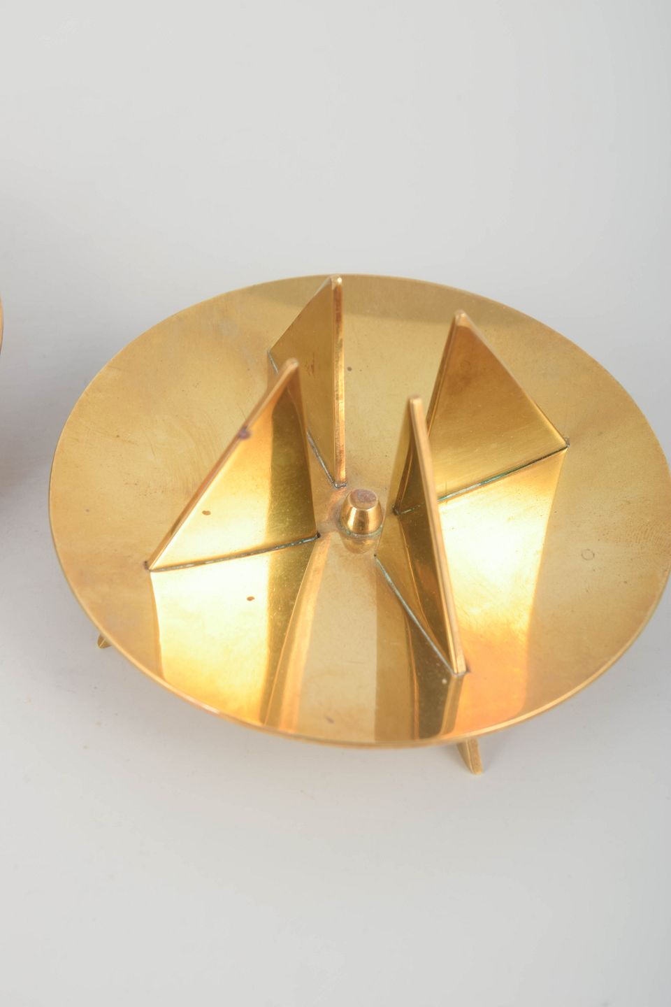 Elegant og skulpturel formgivning i massiv messing med karakteristiske geometriske elementer, typisk for Forsells modernistiske udtryk for Skultuna.
