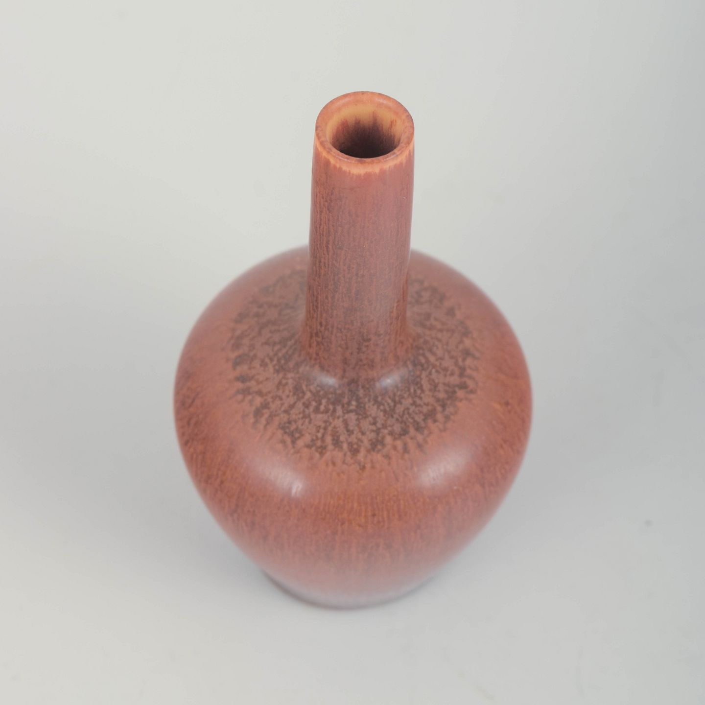 Small, elegant stoneware vase with rounded body and slender cylindrical neck, decorated with a warm reddish-brown glaze with a nuanced, lightly textured surface – a fine example of Stålhane’s confident forms and subtle glaze work.