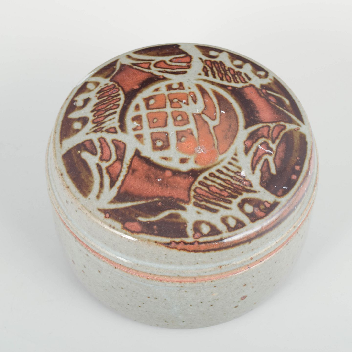 Unik lågkrukke i kinesisk-inspireret stil med dekorativ reliefdekoreret låg og lys celadonlignende glasur. Signeret.