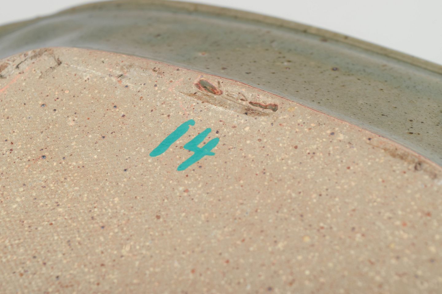 Unikt kvadratisk fad i kinesisk-inspireret stil med dekorativ relief- og penselmalet dekoration samt lys celadonlignende glasur med farvede detaljer. Signeret.
