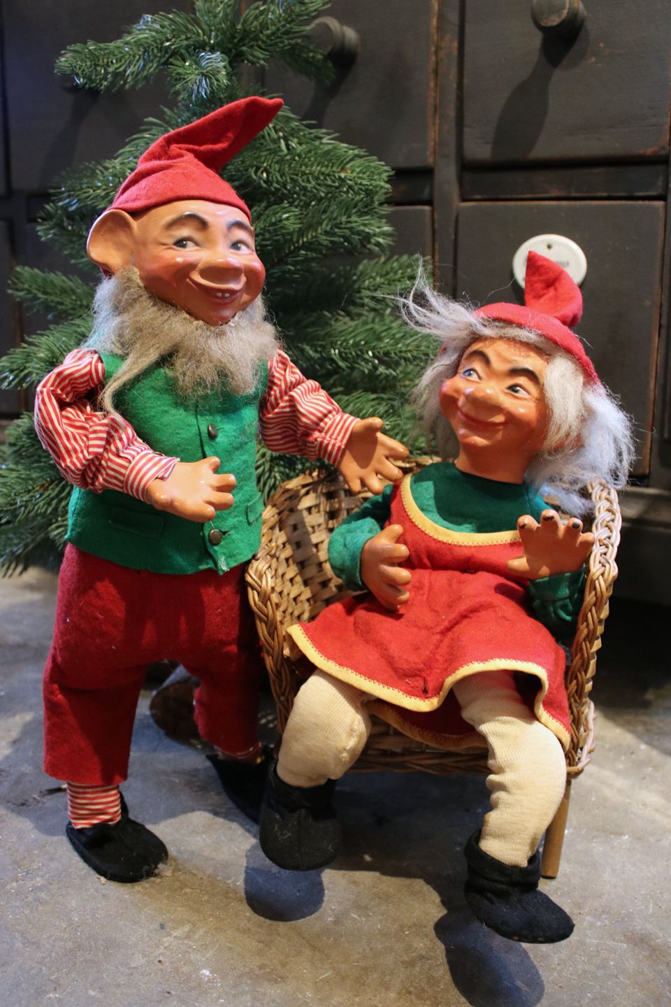 2 gamle butiksnisser med filt tøj og ansigt i bemalet papmache.