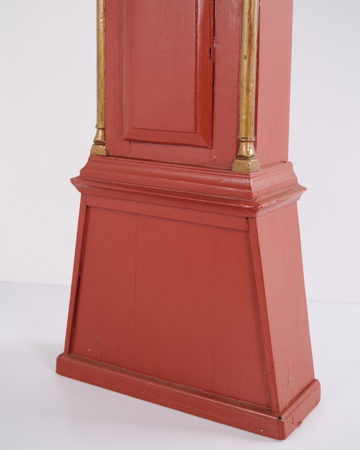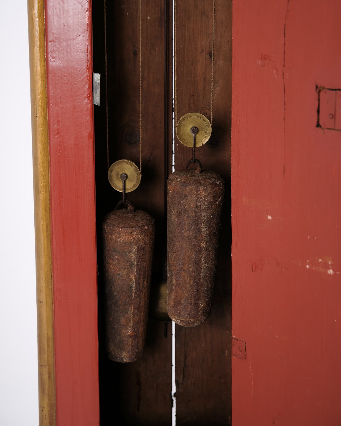 Bornholmerur fra ca. 1820’erne, rød­bemalet med dekorative udskæringer og klassisk formsprog fra perioden. Et originalt standerur med karakter og tidsrigtige detaljer.