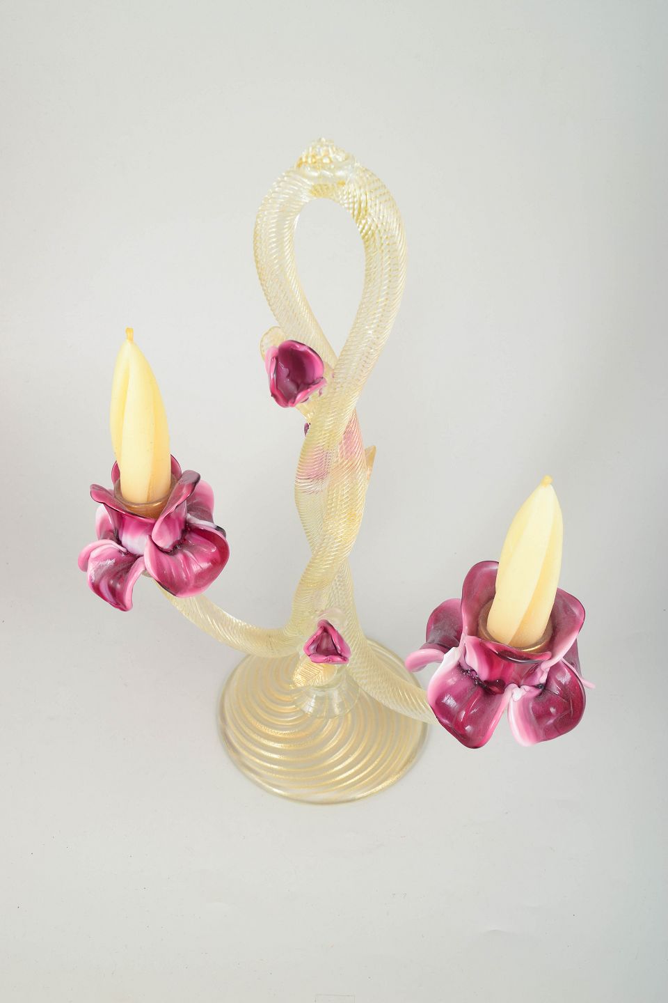 Imponerende mundblæst Murano-lysestage med to lysholdere, udført i spiralformet klart glas med guldstøv (avventurina) og dekorative blomster i dybe rosa/purpurfarver. Et elegant og skulpturelt stykke italiensk glasdesign fra 1960’erne.