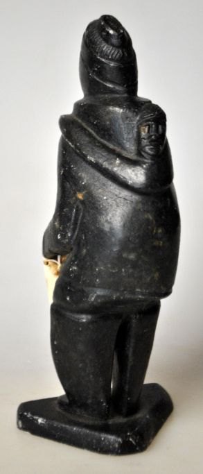 Greenlandic soapstone figure of a woman with child and ulut, 20th century. Made by E.M Petersen, Paamiut (Frederikshåb). H.: 13 cm.