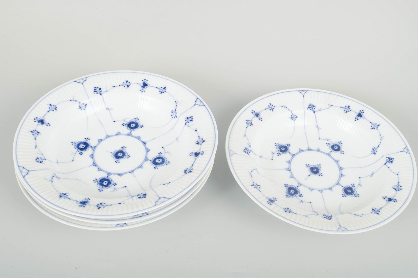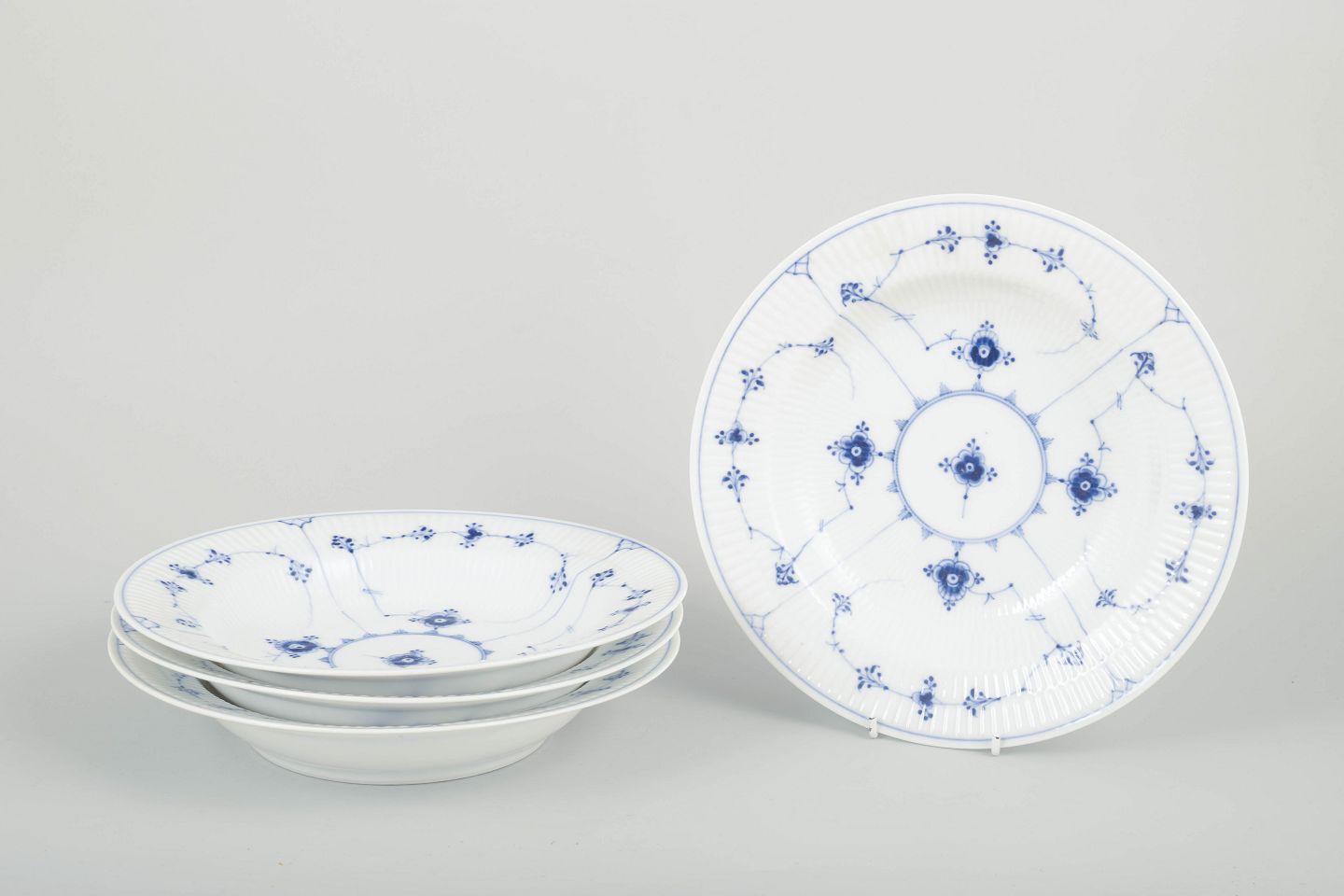 Sæt á fire dybe tallerkener i klassisk Musselmalet porcelæn med håndmalet blå dekoration og riflet korpus. Elegant og tidstypisk udførelse fra begyndelsen af det 20. århundrede.