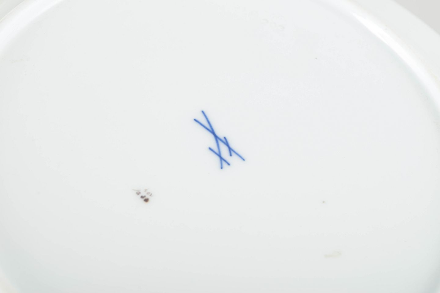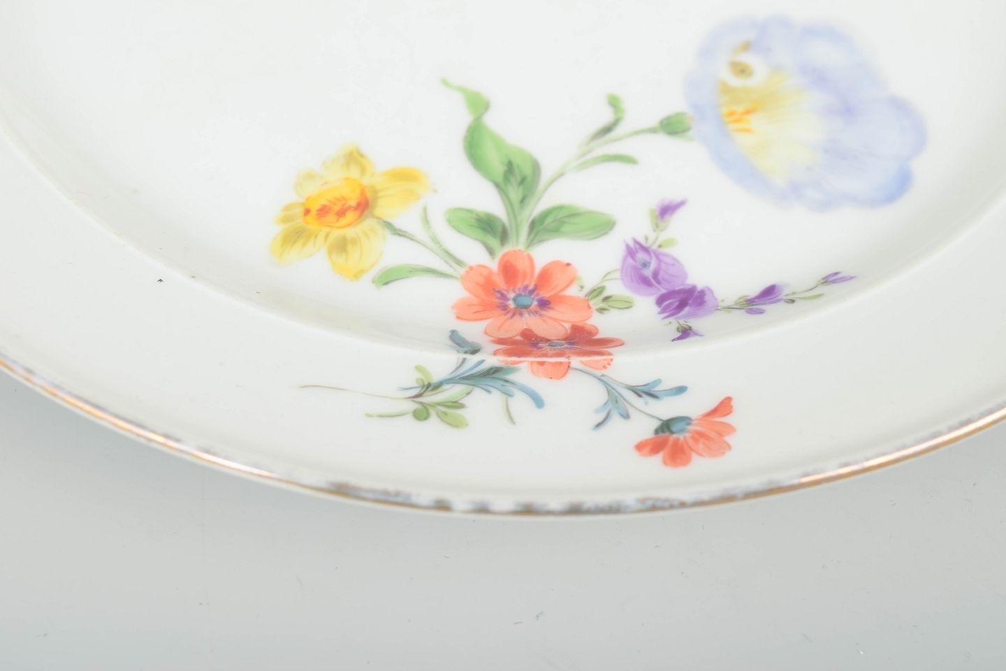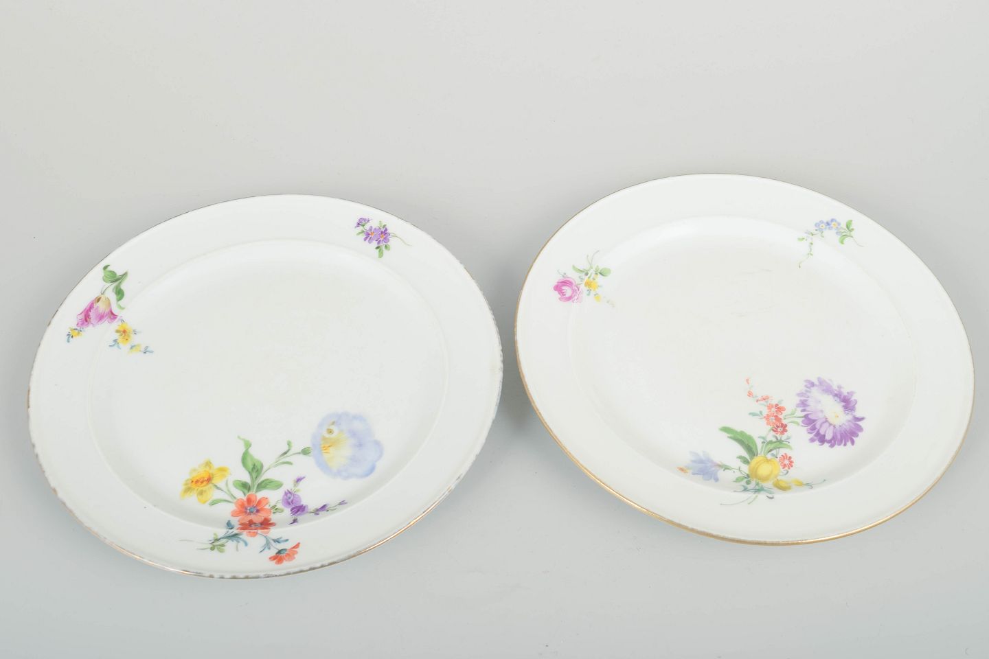 To fine tallerkener i hvidt porcelæn med håndmalede blomsterdekorationer i klassisk Meissen-stil. Begge eksemplarer med delikat guldkant.