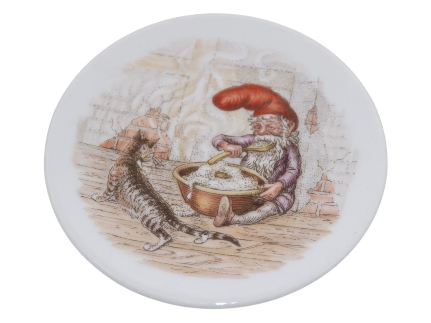 Royal Copenhagen julestel, lille asiet med julenisse, risengrød og kat.