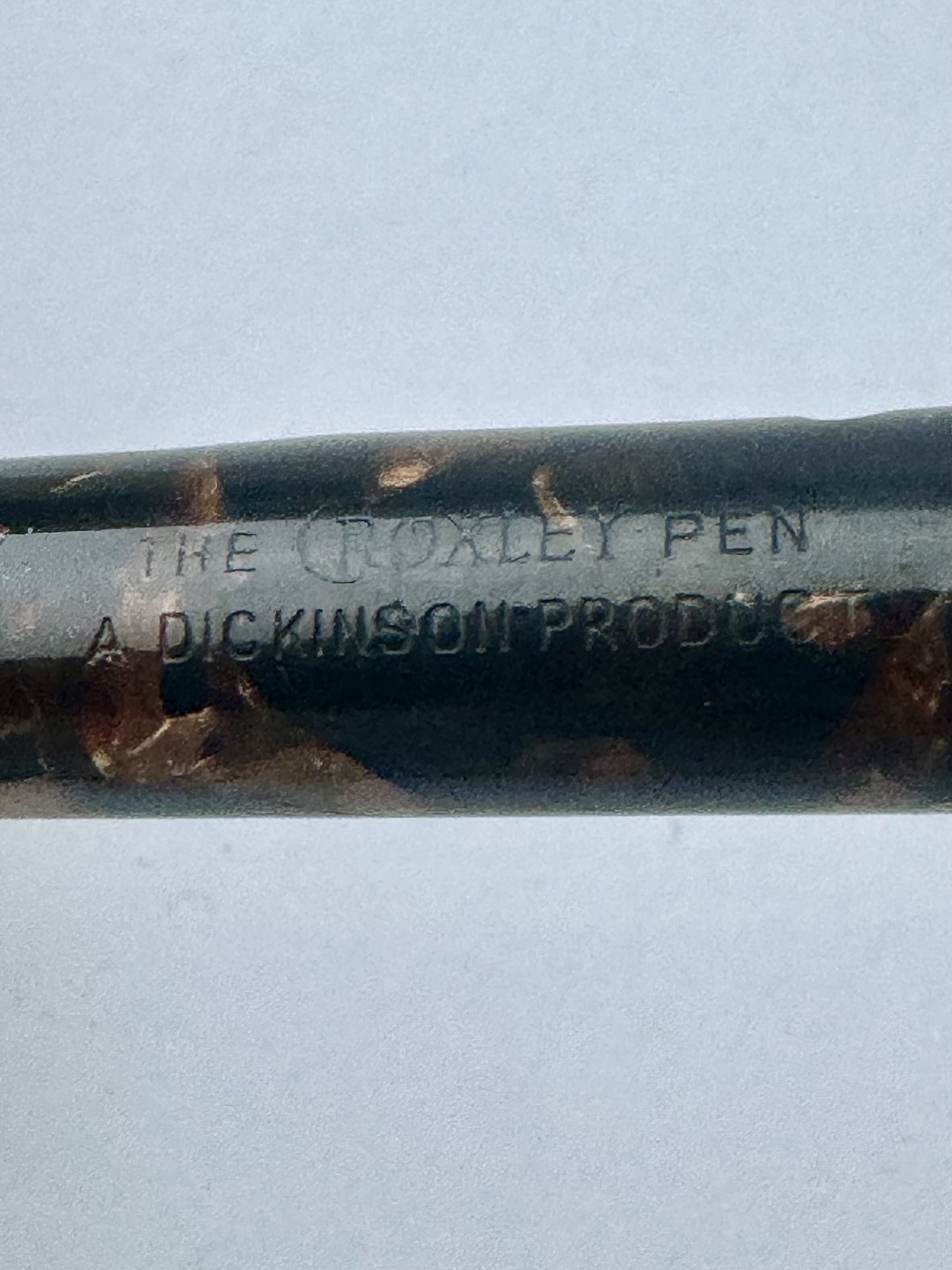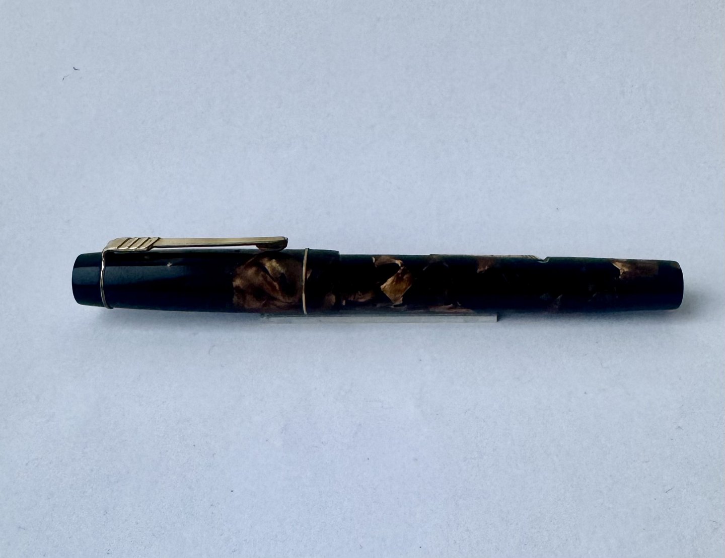 Black and brown marbled Croxley fountain pen. Lever filler ink refill system. New rubber sack must be inserted before the pen can absorb ink and write again. Unoriginal 14 carat gold nib. Length: 12.5 cm
