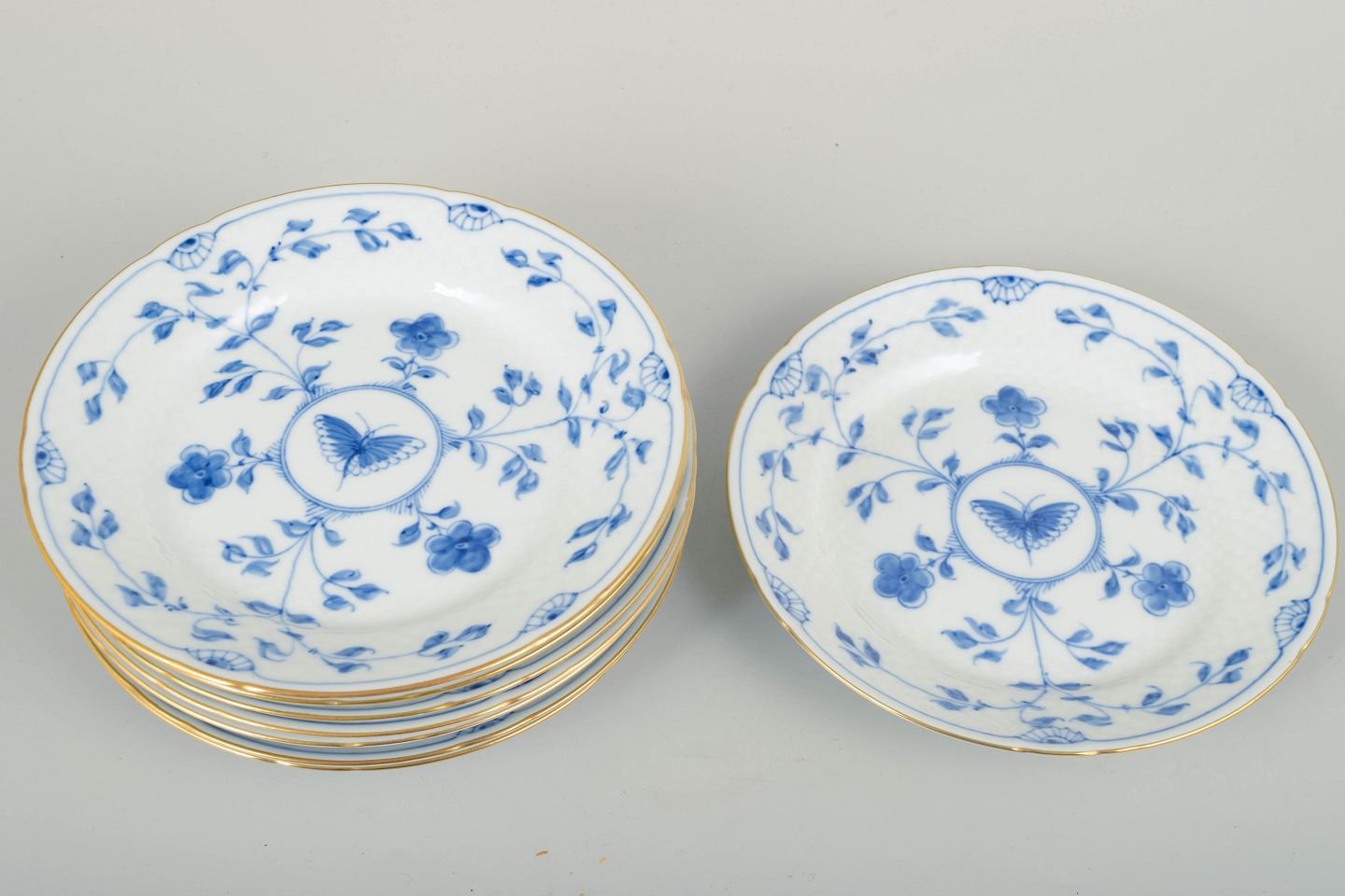Smukt sæt på otte desserttallerkener med håndmalet sommerfuglemotiv og blå blomsterornamentik, afsluttet med en elegant guldkant.