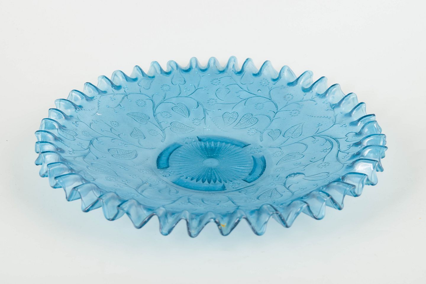 Dekorativt glasfad i lyseblå presset glas med bølget kant og indpresset blomster- og rankemønster. Et typisk eksempel på nordisk glasproduktion fra perioden, hvor funktionelle hverdagsgenstande blev udformet med markant ornamental finesse.