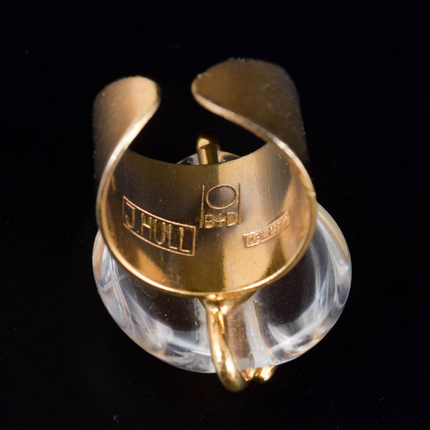 Skulpturelt ringdesign med massiv sølvskinne og en stor organisk formet glassten, indfattet i Hulls karakteristiske dramatiske udtryk. Den transparente sten har et varmt gyldent skær og en markant struktureret kerne, som giver ringen et skulpturelt og smykke-kunstnerisk præg.