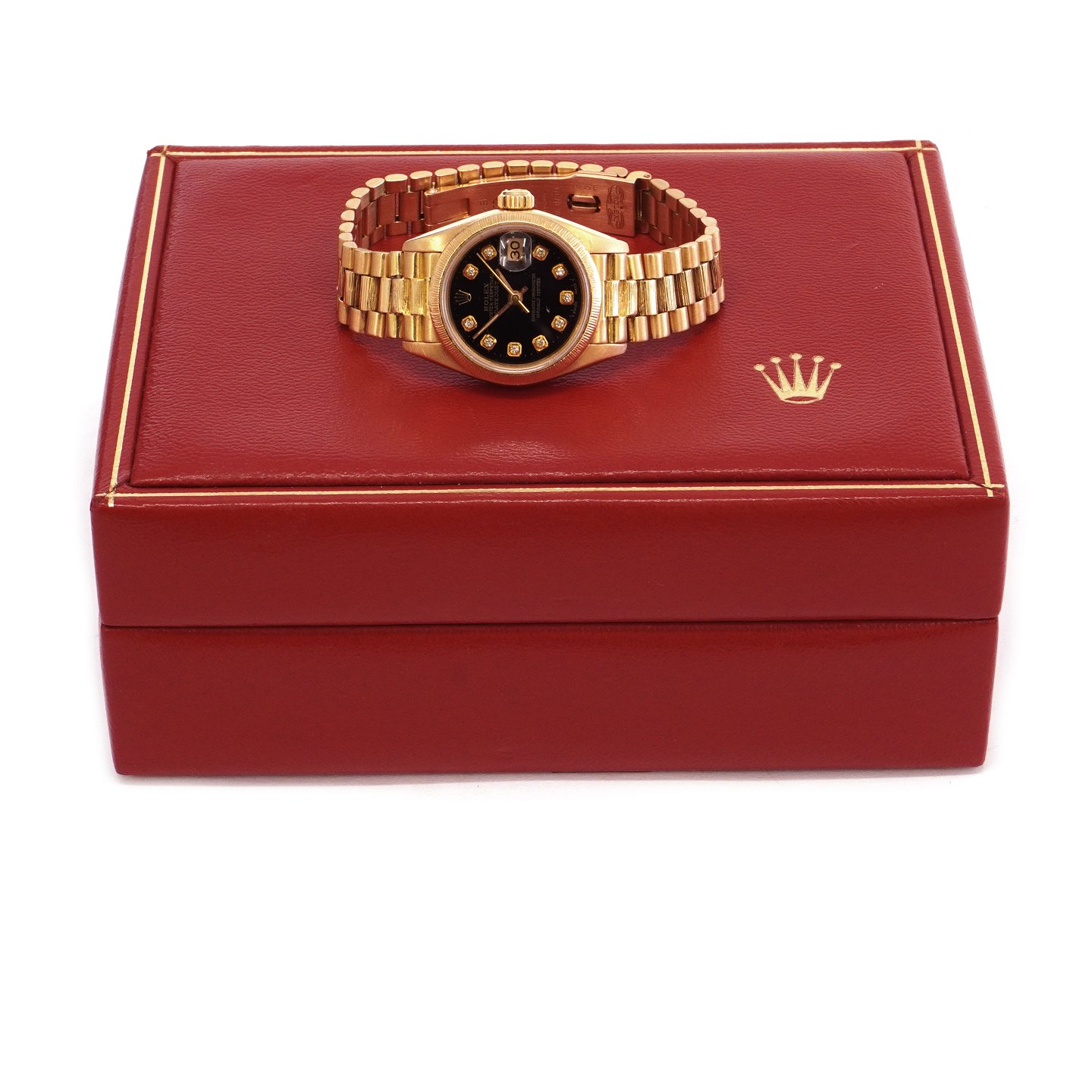 Rolex Oyster Perpetual Datejust ref. nr 69178 i 18kt guld og sort skive med diamanter som timemarkører. D: 26mm. Leveres med boks, certifikat og købskvittering. Solgt første gang 23/12 1985
