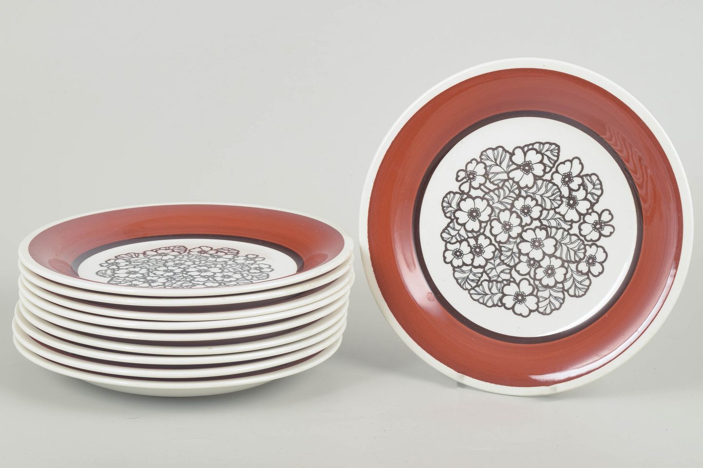 Sæt på ti stentøjstallerkener med den ikoniske blomsterdekoration i brune og sorte nuancer, typisk for Gefles 70’er-design. Enkle, funktionelle former kombineret med grafiske mønstre skaber et tidstypisk og dekorativt udtryk.