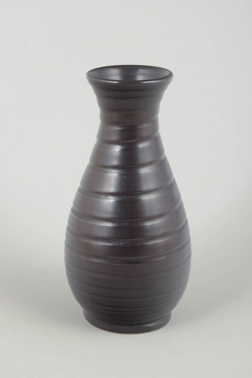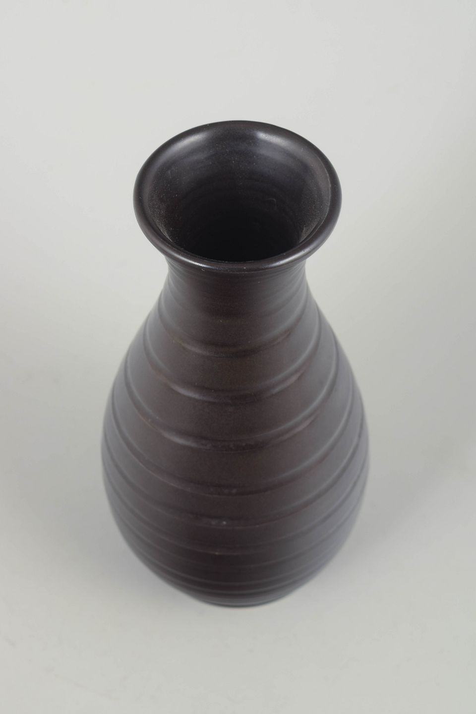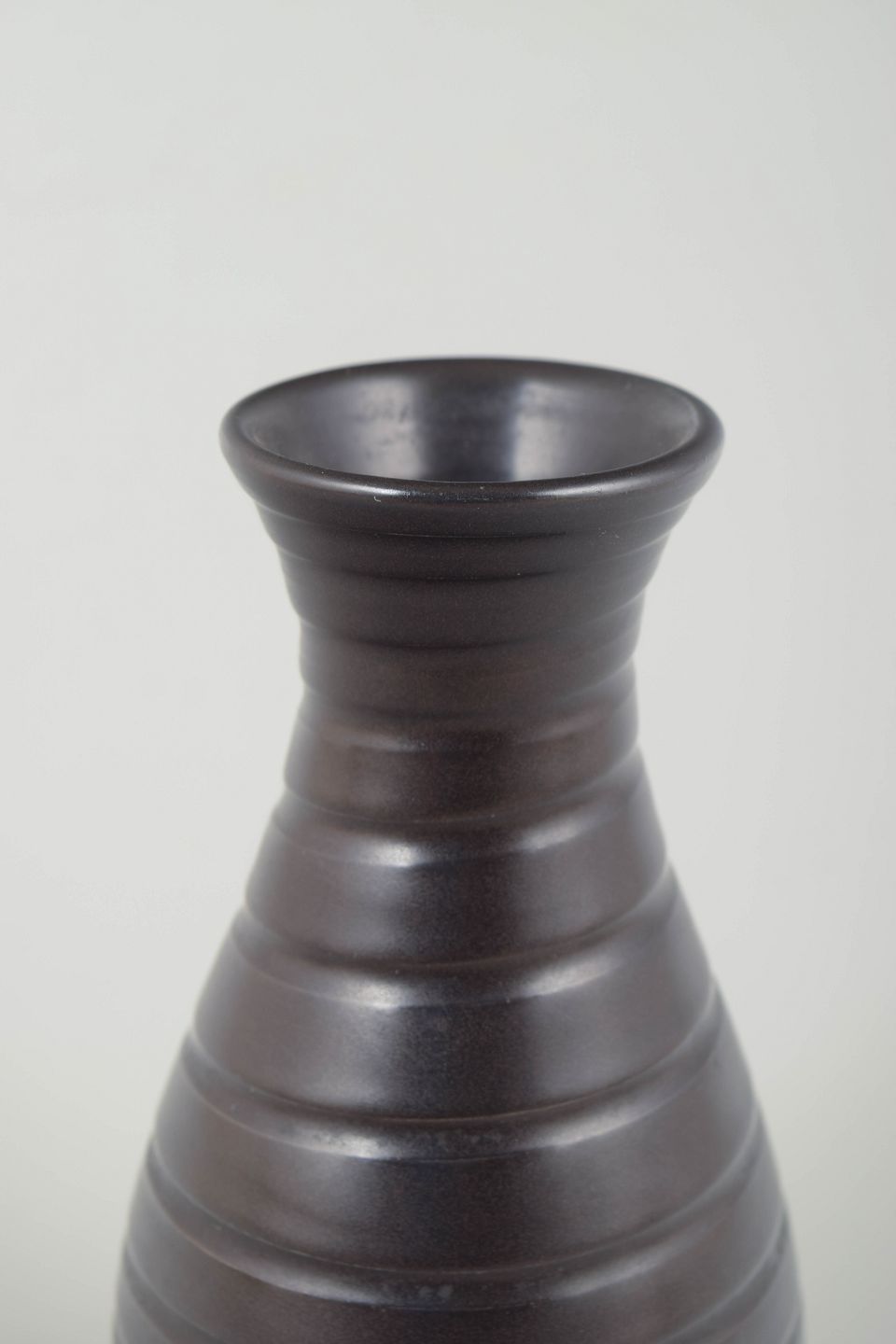 Hand-thrown pottery vase with a dark brown glaze and pronounced throwing rings that create a rhythmic, tactile surface. The classic teardrop form and understated proportions are characteristic of Bo Fajans’ handmade ceramics from this era.