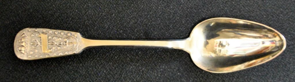 Skipperske  sølv. 1875. Pärnus, Estland. Fra firmaet Jacob Jacke & Co. Givet som gave til skipper J. R. Eriksen. Navn indgraveret. Ske dekoreret med bl.a. anker og sejlskib. Ukendt sølvmester. L.: 21 cm. Med gravering på laf.