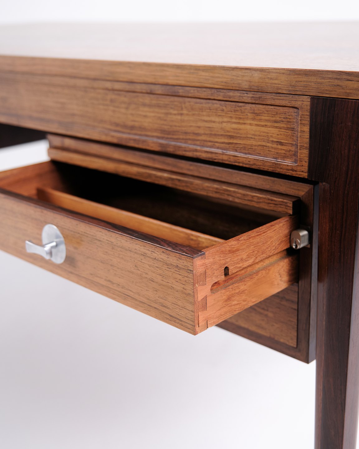 Diplomat skrivebord designet af Finn Juhl for France & Søn omkring 1961. Udført i palisander med rektangulær bordplade og to svævende skuffemoduler. Hvert modul rummer en udtræksskriveplade og to skuffer, alle med børstet stålgreb. Et eftertragtet Finn Juhl design med markant formsprog og eksklusive materialer.