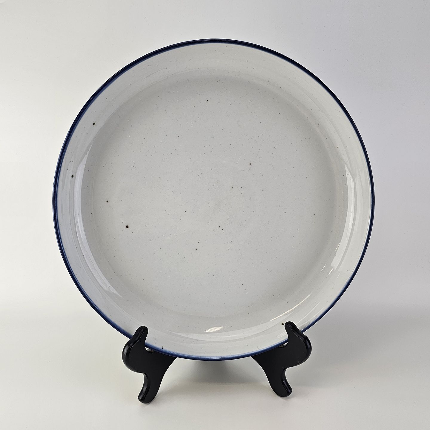 Rundt fad i stentøj med blå kant, jernpletter og hvid glasur