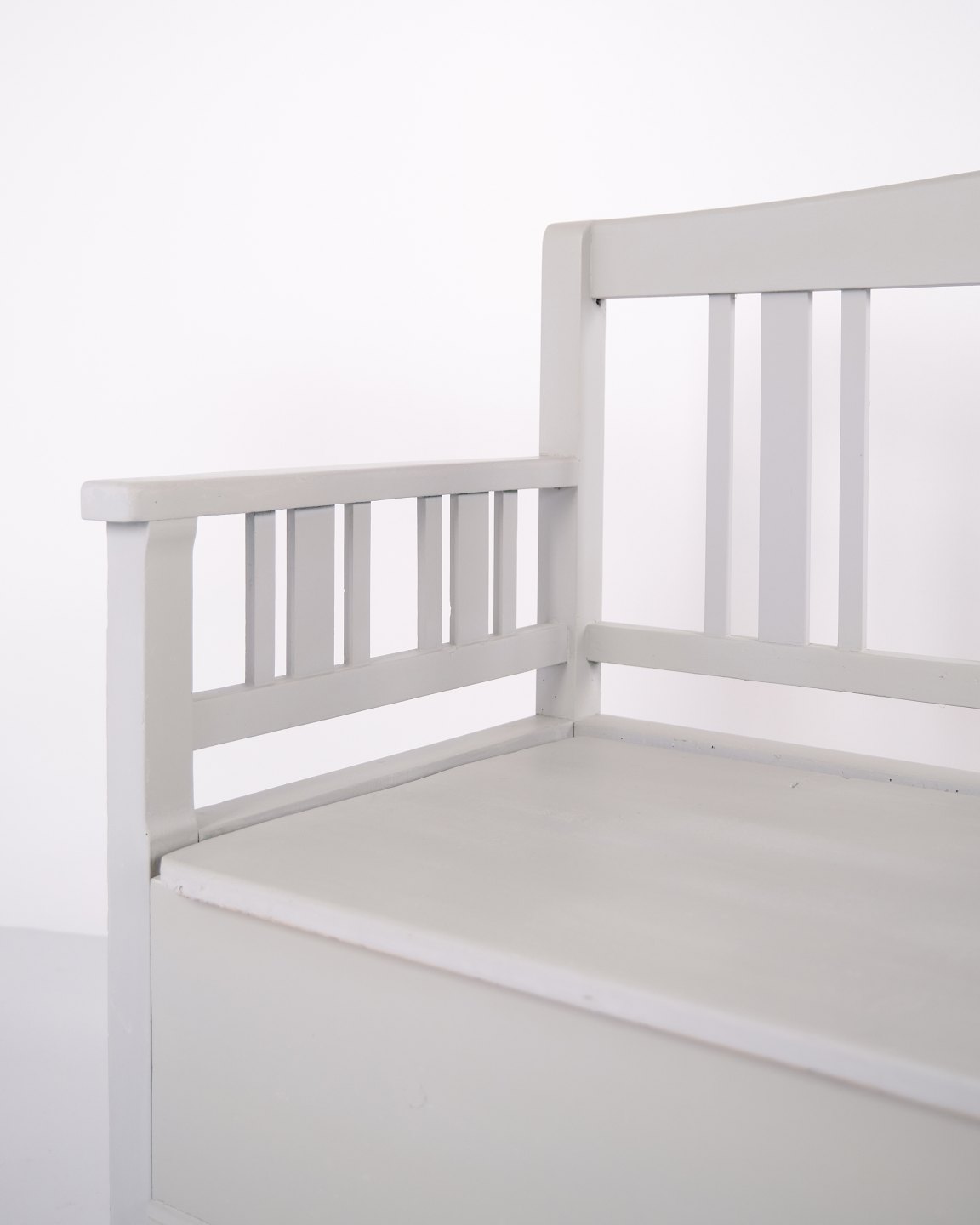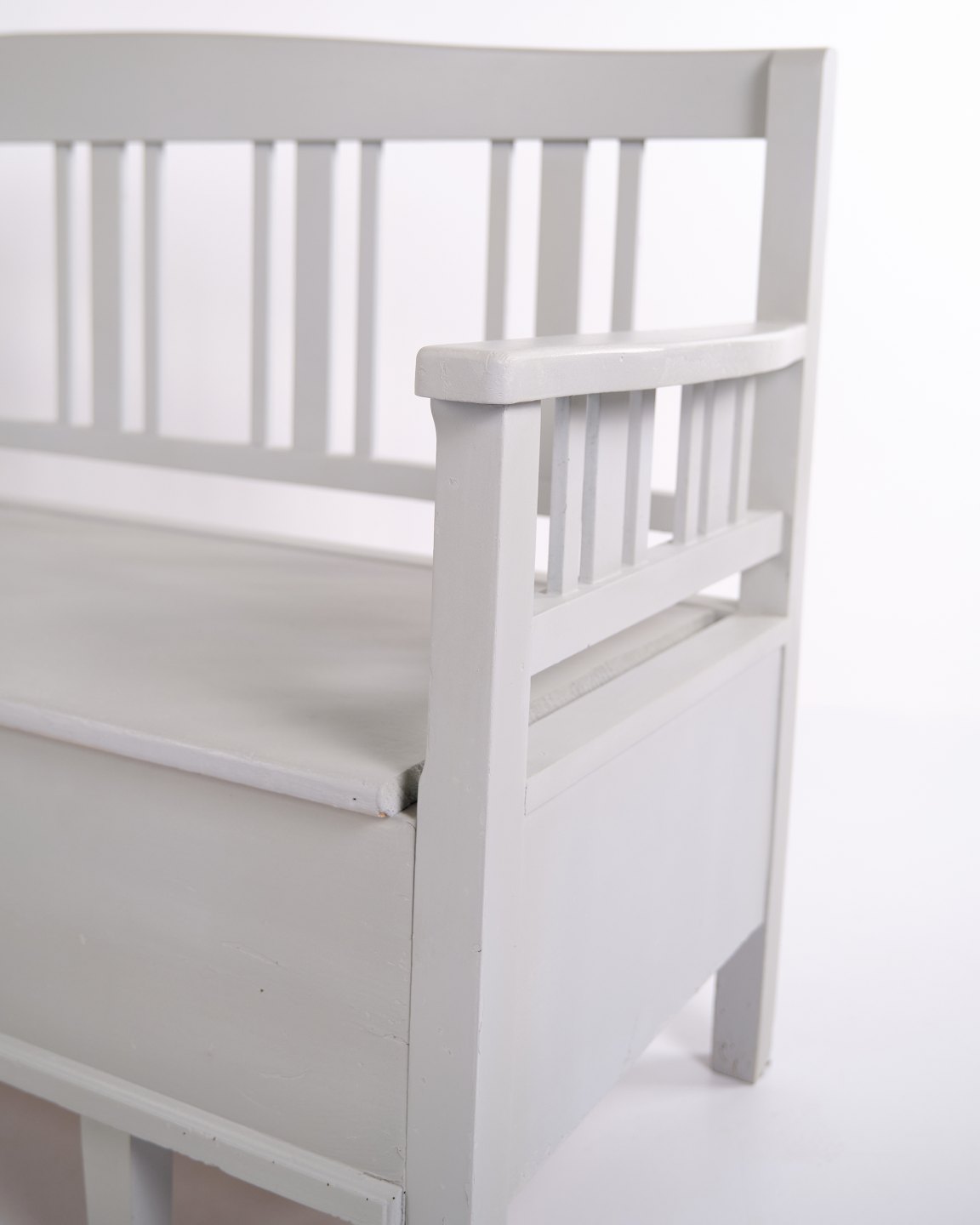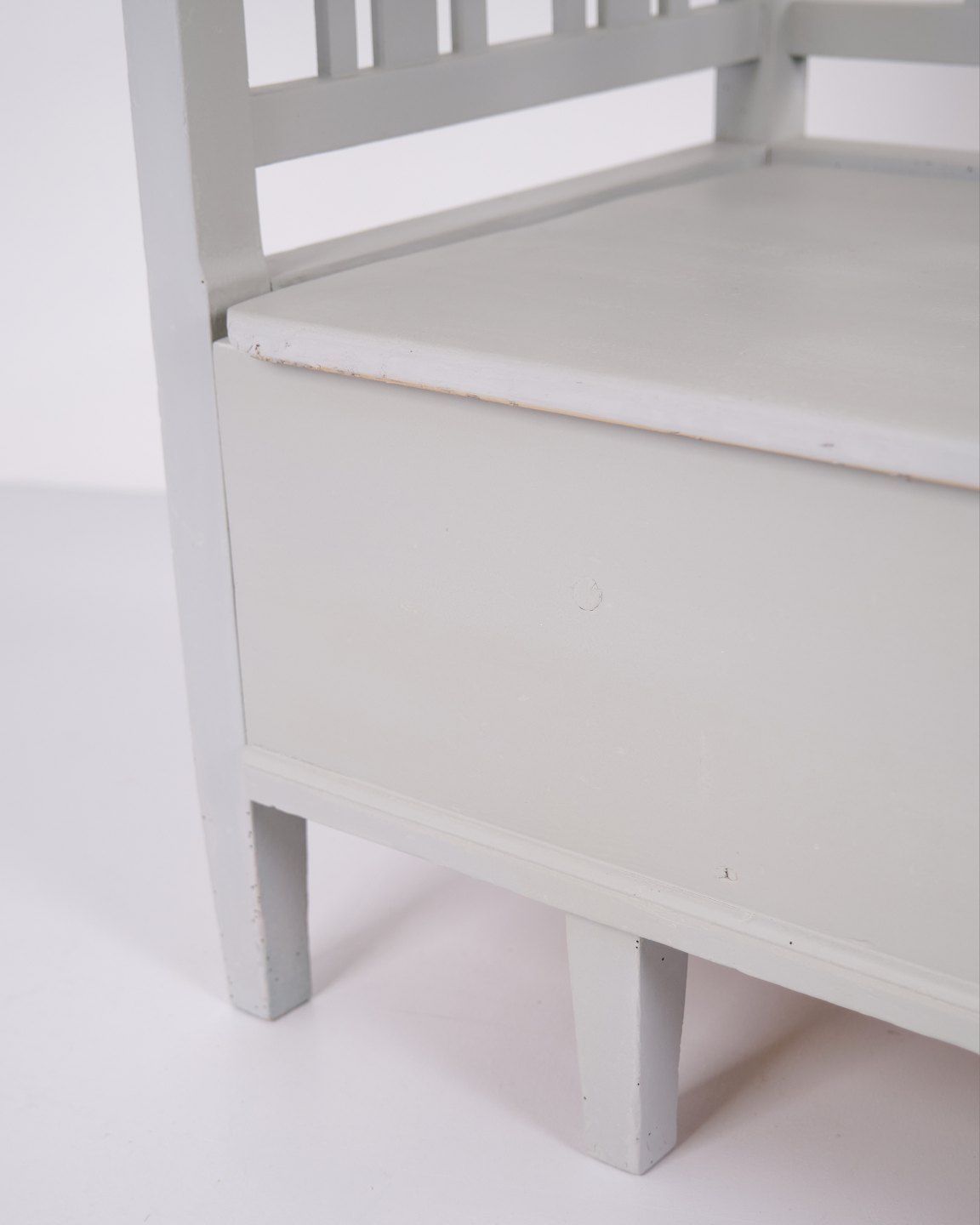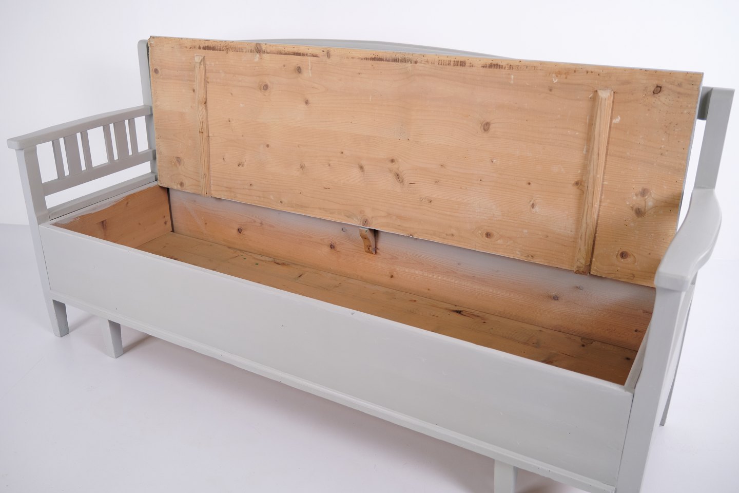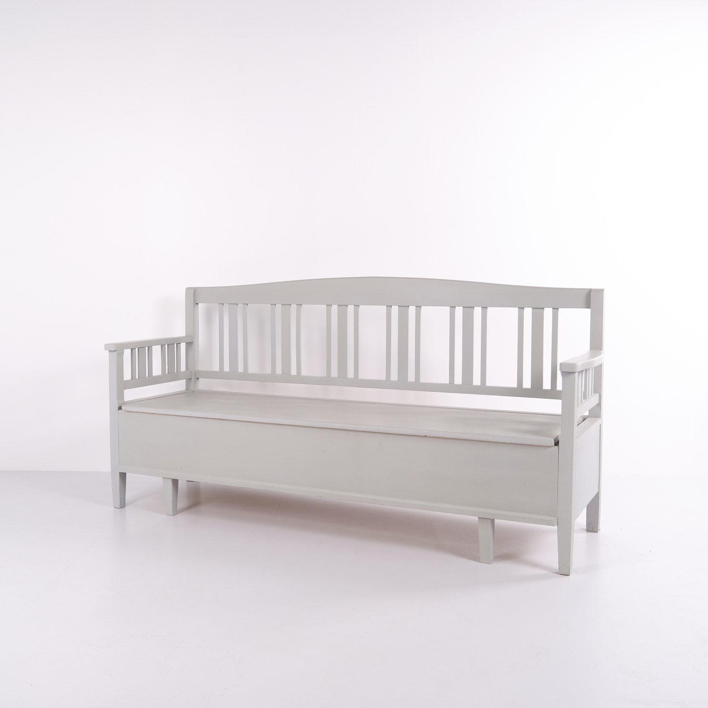 Svensk slagbænk fra ca. 1860’erne, udført i fyrretræ og gråmalet i senere tid. Klassisk skandinavisk møbel med dekorative bemalinger og god opbevaringsplads under sædet. Velbevaret antikt møbel med tidstypiske detaljer.
