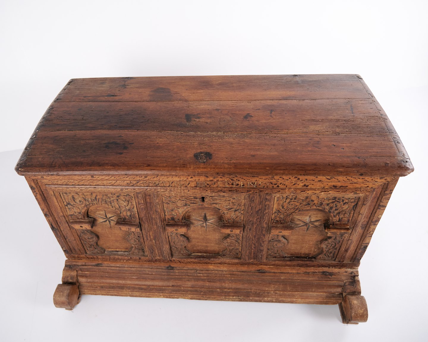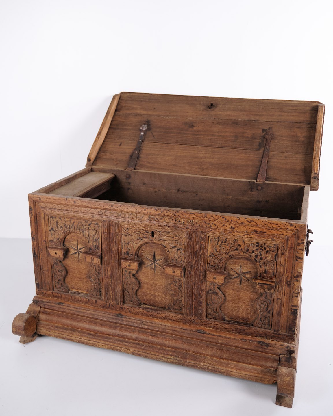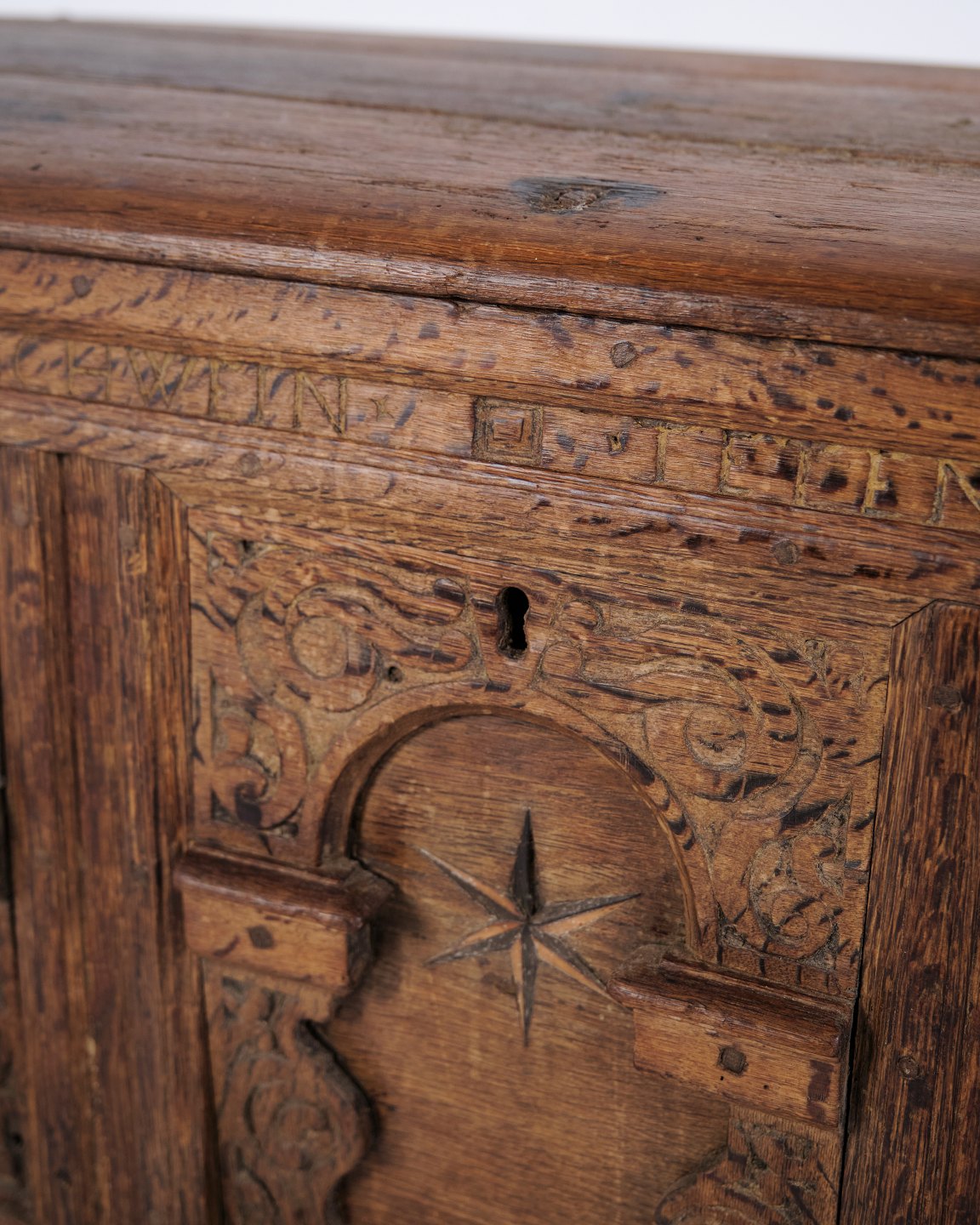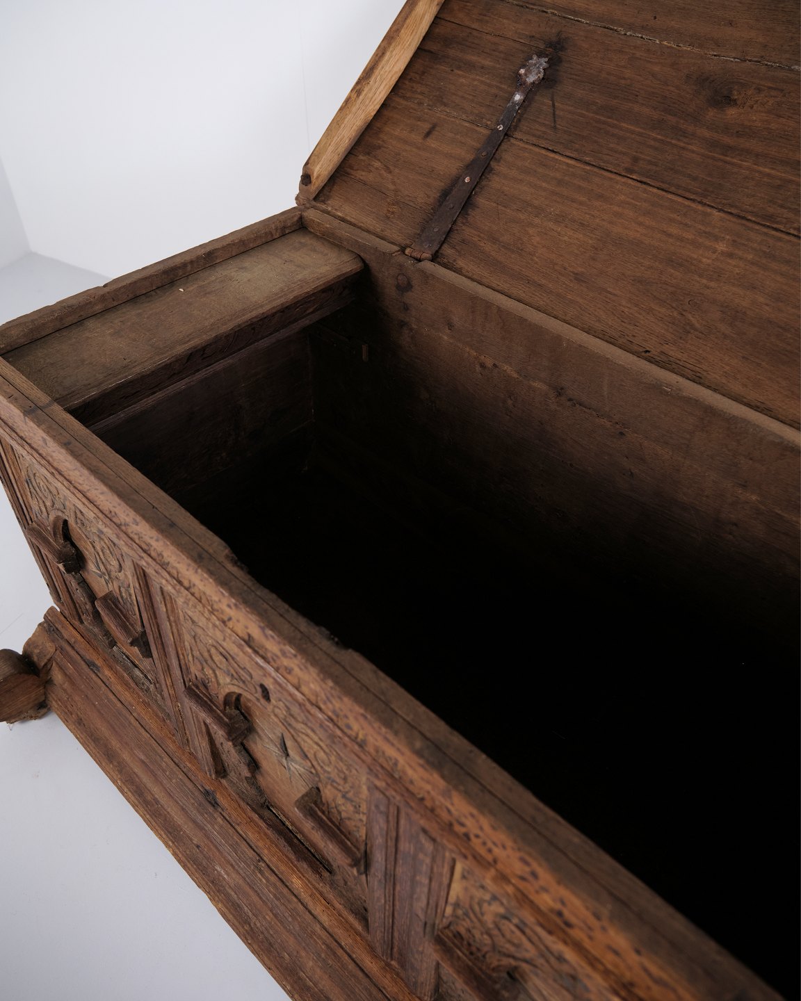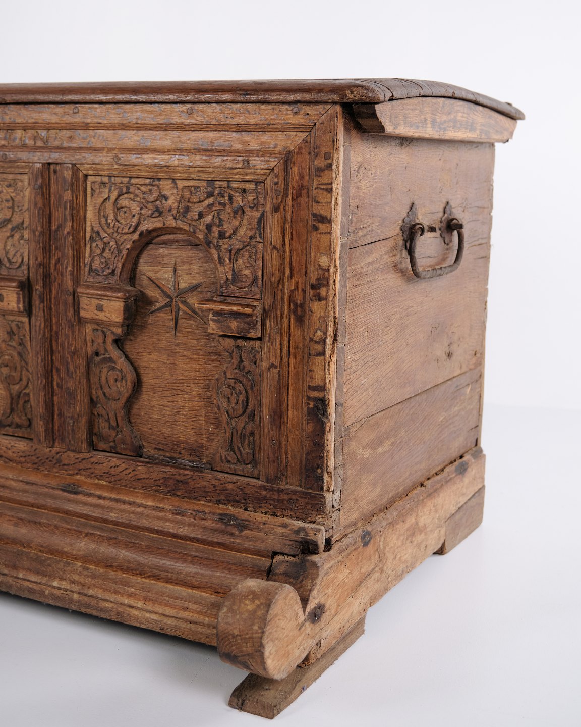 Kiste fra ca. 1860’erne, udført i egetræ med håndskårne detaljer og intarsia. Et dekorativt og solidt antikt møbel med karakteristiske udsmykninger fra perioden. Velegnet til opbevaring og som dekorativt interiør.