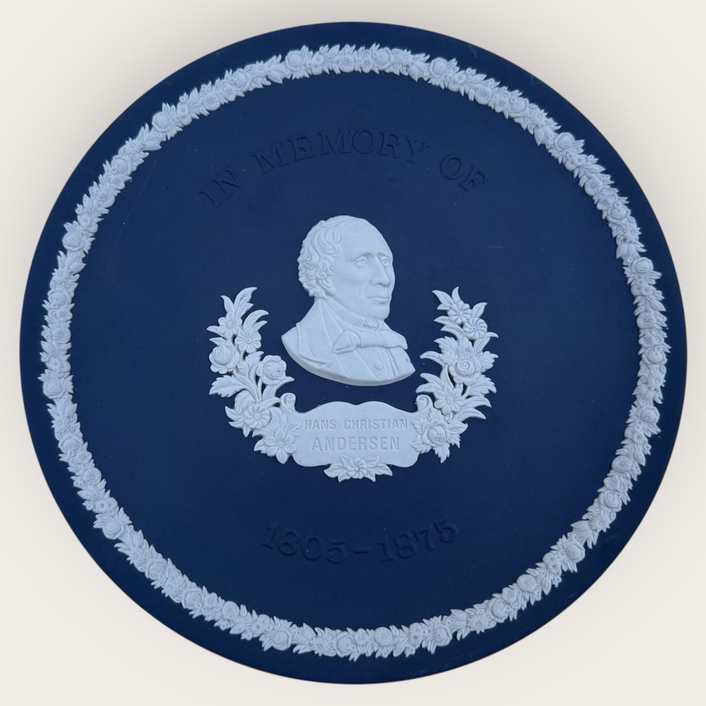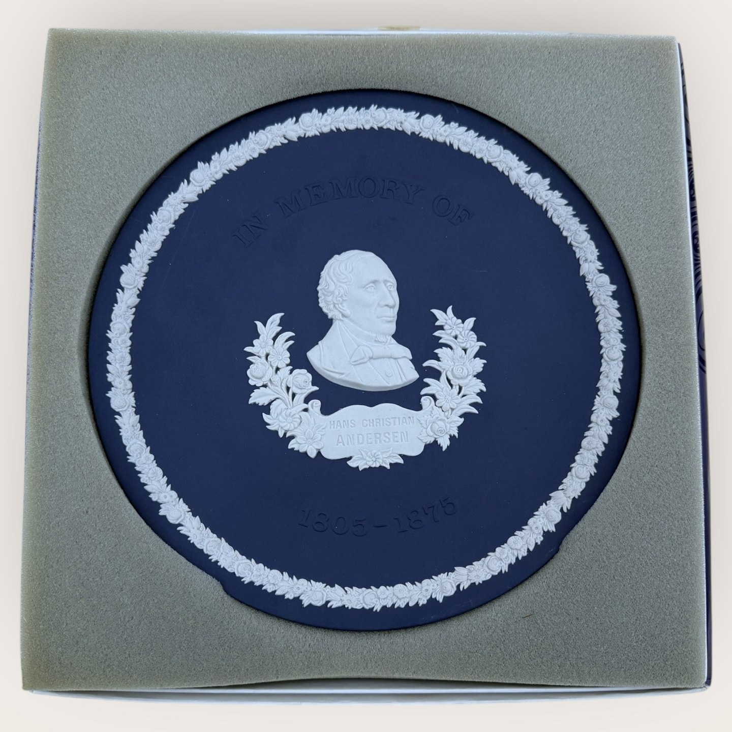 Wedgwood, H.C. Andersen, Mørkeblå Mindeplatte, " In memory of H.C. Andersen 1805-1875", platte no. 1045 af 2000 stk, Diameter 20,5cm, i original æske *perfekt stand*