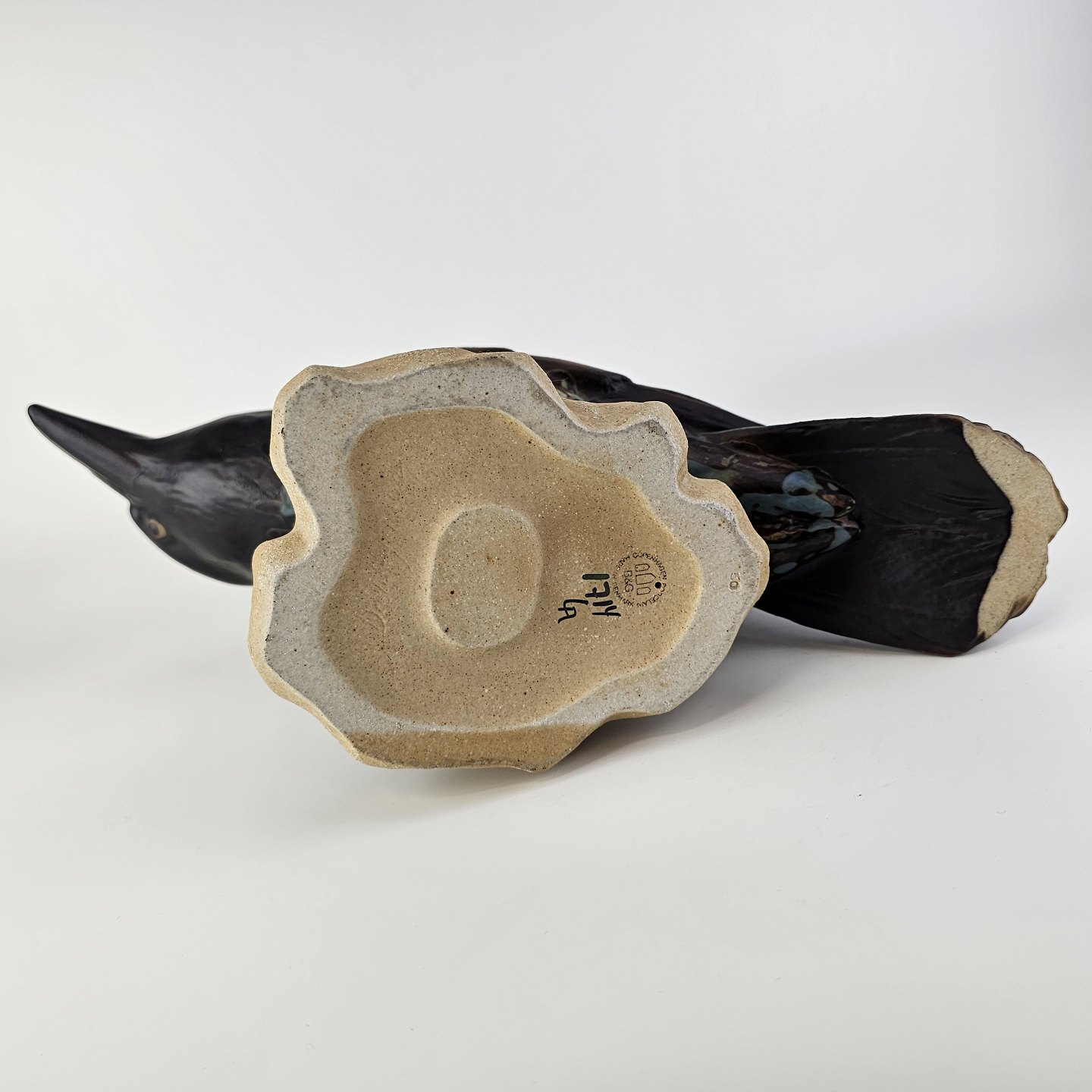 Figur i stentøj med motiv af en krage på en sten